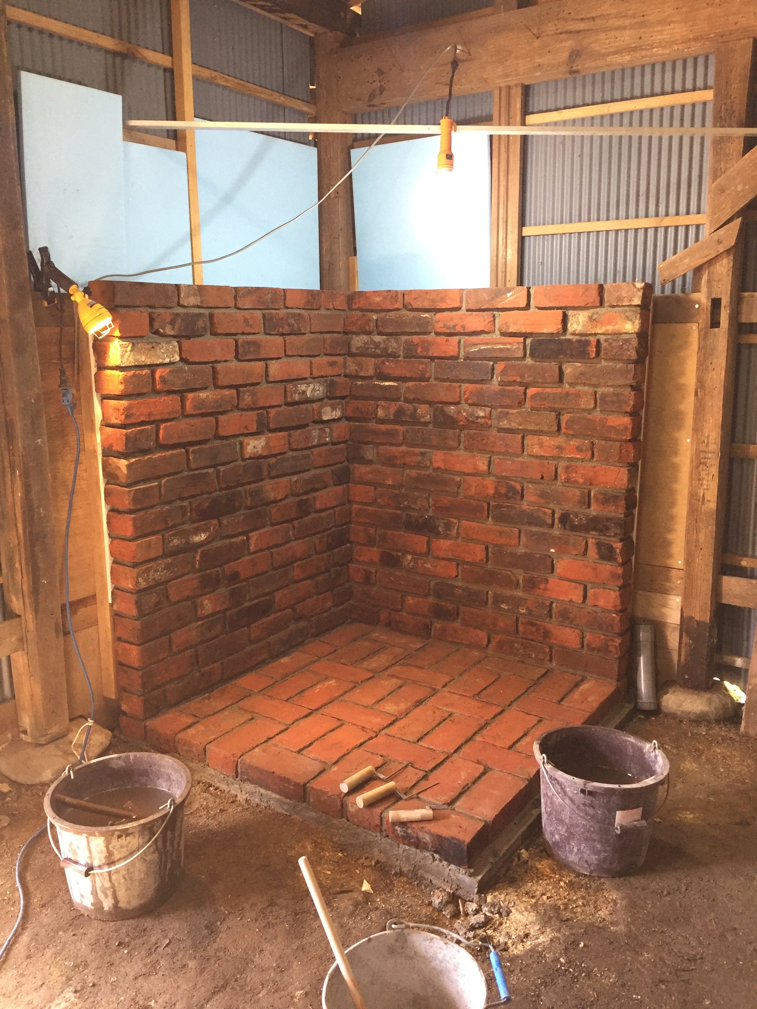2月20日〜2月24日までの5日間で、ななな、なんと!薪ストーブを設置する「炉台」が完成いたしました。先日の作業から続けてご紹介すると、まず、ストーブの熱による“自然発火”を防ぐために、耐火断熱材を張り付けました。文章に書くと、簡単に思えますが、これがまた細かい計算が必要でして。〈〈私には無理です!〉〉というわけで、前回レポートから登場いただいてる、棟梁の草壁師匠のご登場です。ピシーーっと、キメる草壁師匠!要なのは、角の“束石”!石の丸いカーブに対してどのように板をはめ込むのかと心配しましたが、撫でるようにカンナで板を削ってバランスをとり、この仕上がりです。すご。ぴったり!ベニヤ合板で素地を作ったあとは、角材を入れて4センチくらいの空間をとり、そこにケイカル板を、バンバンバン!と。(ケイカル板とは、水酸化カルシウムと砂を主原料として板状に成型した耐火断熱材です)このケイカル板を、丸のこで切断したのですが、その時の白いモヤのような埃がすごいのなんの…!ホームセンターで切れたら便利なのに〜。(←頼んだら断られた)そうこうして完成したこの断熱加工の壁!!!素晴らしい!!美しい!ここまで来たら、バトンタッチ!同じ吉野町内の国栖を拠点に庭師をされている「風人園」の大西親方と、大阪(金剛山寄り)で庭師をされている高橋プロです。庭師さんは植木の手入れだけでなく石積みもします。そして花壇などでは、レンガを積みます。その匠の技で、しだのこLaboを助けに来てくださったのです!ありがとうございます!使用するレンガは、大西親方のご紹介で、素晴らしい風合いのアンティークレンガをいただくことができました。ひとつひとつ、積み上げて運び込みます。大きなトラックはクレーン付き。大西親方のご協力で1回で運び終えることができました。いや〜、レンガって、重いんですね〜!300個ほどのレンガを運んで良い筋トレになりました;レンガは、使用する前に水で泥を落として、水分をふくませます。これは、つなぎのセメントから水分を奪ってしまわないようにするためです。(水分が奪われるとセメントの強度が落ちます)レイアウトを考えるのに頭を悩ませましたが、何度か組み替えてデザイン決定!決まればあとは積むのみ!と、現場の空気に気合が入ります。笑コンコンとリズミカルな音と、ジャリジャリ!とセメントを塗ったり、こそげとる音がひびきます。すごい集中力。そんな中で、高橋プロ「ギバちゃんとってください!小さいギバちゃん、あります?」大西親方「はいよ」という会話が聞こえてくる。「ギバちゃん!???柳葉敏郎?柳葉敏郎に小さいも大きいもないでしょ」と私は思っちゃうわけで。素人なので、道具までも面白い!はい、こちらが“ギバちゃん”です。可愛い。そんなことは置いておいて、リズミカルにどんどん積み上げていく高橋プロ。もともと音楽のバンドマンをされていたそうです。どおりで!リズムが心地よい。笑積み上がるレンガは、角が取れていて、色も形もそれぞれバラバラで素敵!もともと、イギリスの古いお城で使われていたものだそうです。ロマンです。レンガ作業二日目と三日目は、大西親方が丁寧に水平を取りつつ丁寧に仕上げてくださいました!(ちょっと縦の画像になりますが)レンガって、大きさを半分にしたり、ちょびっと削ぎ落としたりして、サイズ変更しなきゃいけないんですが。その作業がとても危険!ちゃんとした道具がないとできないことです。カットをするディスクグラインダーと、切るときに飛び散る破片などの集塵機など。プロの大西親方と高橋プロが協力してくださらなければ、できなかったことなのです。そうして、合計、3日間かかって完成しました!世界に一つだけの、素晴らしいレンガの炉台が出来上がりました!薪ストーブに負けないくらい個性的て、存在感のある出来栄えです。目地もしっかり詰まってますし、草壁師匠の提案で、所々に金具で補強されているので頑丈です。さあ、これでいつでも薪ストーブを迎え入れられる段階になりました!このあとは、床や天井、壁の施工に入っていきます。材料をそろえるところから、もりもり動かないと!よっし!完成形が見えてきましたよ〜〜〜〜〜!!!次の作業は、3月7日と14日です◎