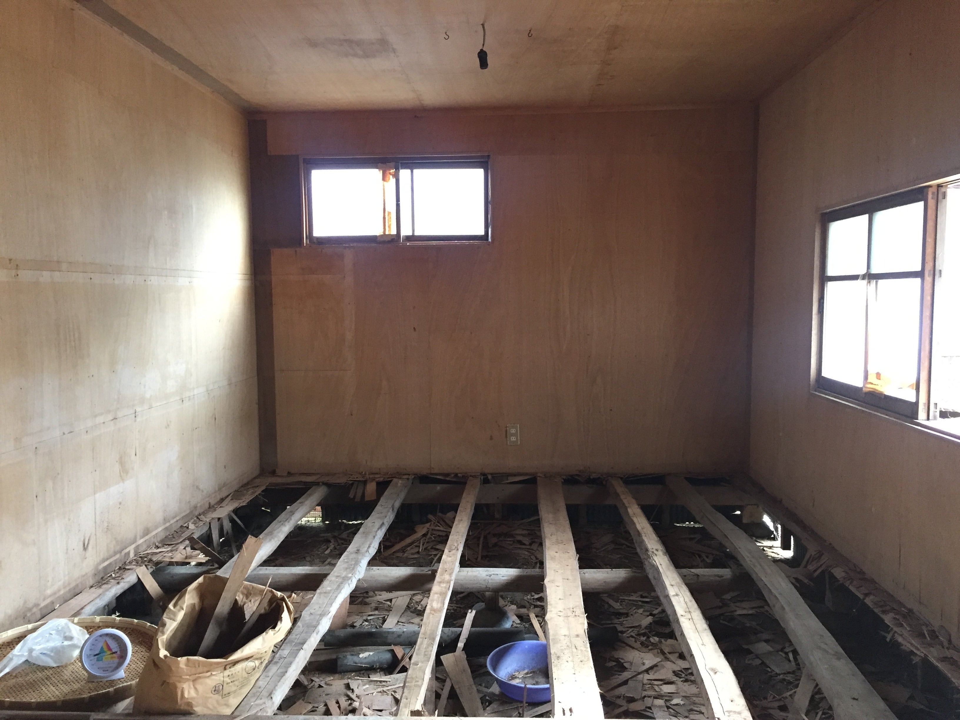 そうして、モノが整理された後、次は、小屋の中を何もない状態にして建物の様子を探るべく、備え付けの棚を分解しました。すると、居間になる場所の床が、湿気でベコベコで穴あき寸前のような状態になっているとわかり、合板の床を全て取り除くことになりました。