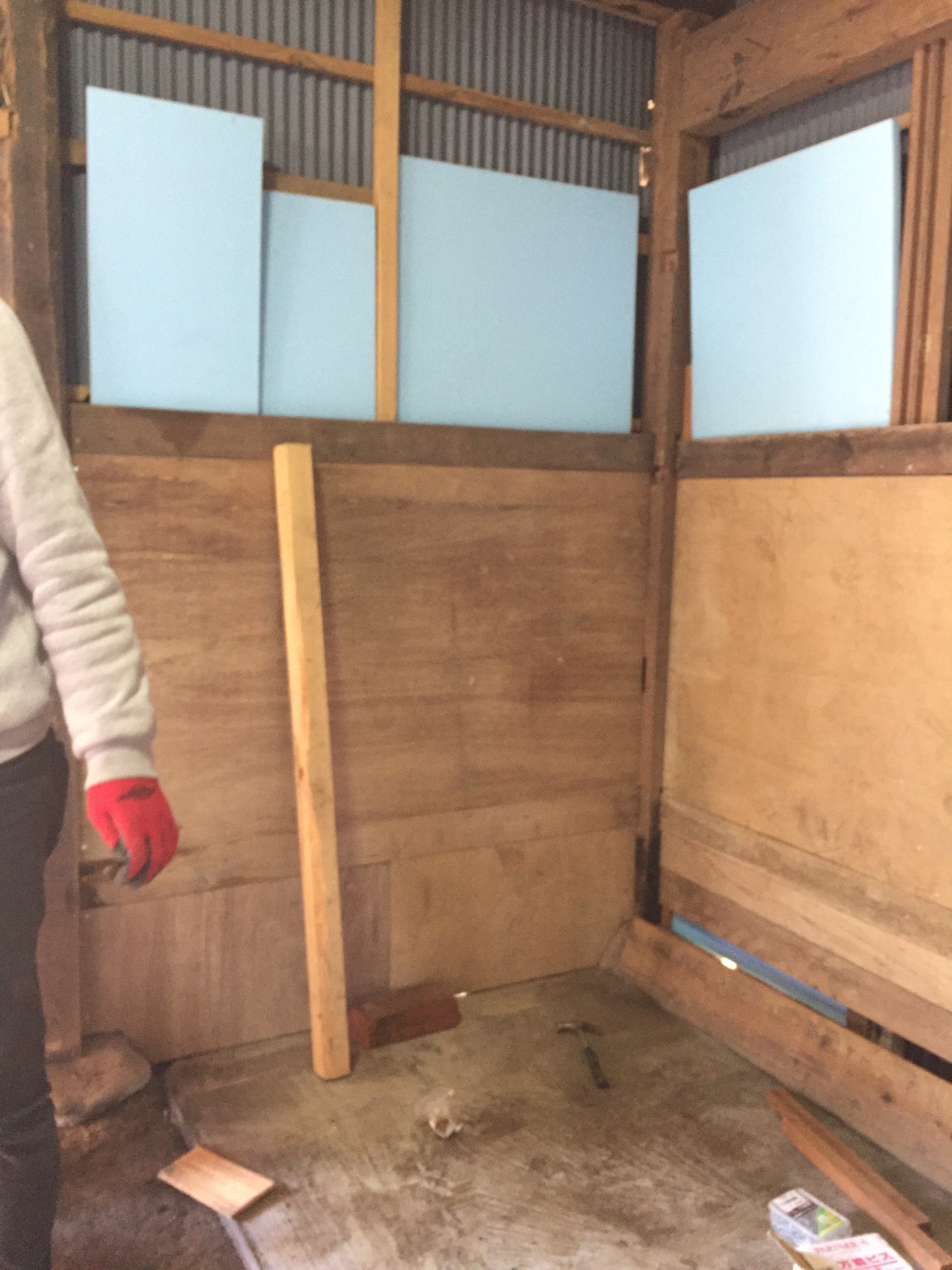 ベニヤ合板で素地を作ったあとは、角材を入れて4センチくらいの空間をとり、そこにケイカル板を、バンバンバン!と。(ケイカル板とは、水酸化カルシウムと砂を主原料として板状に成型した耐火断熱材です)