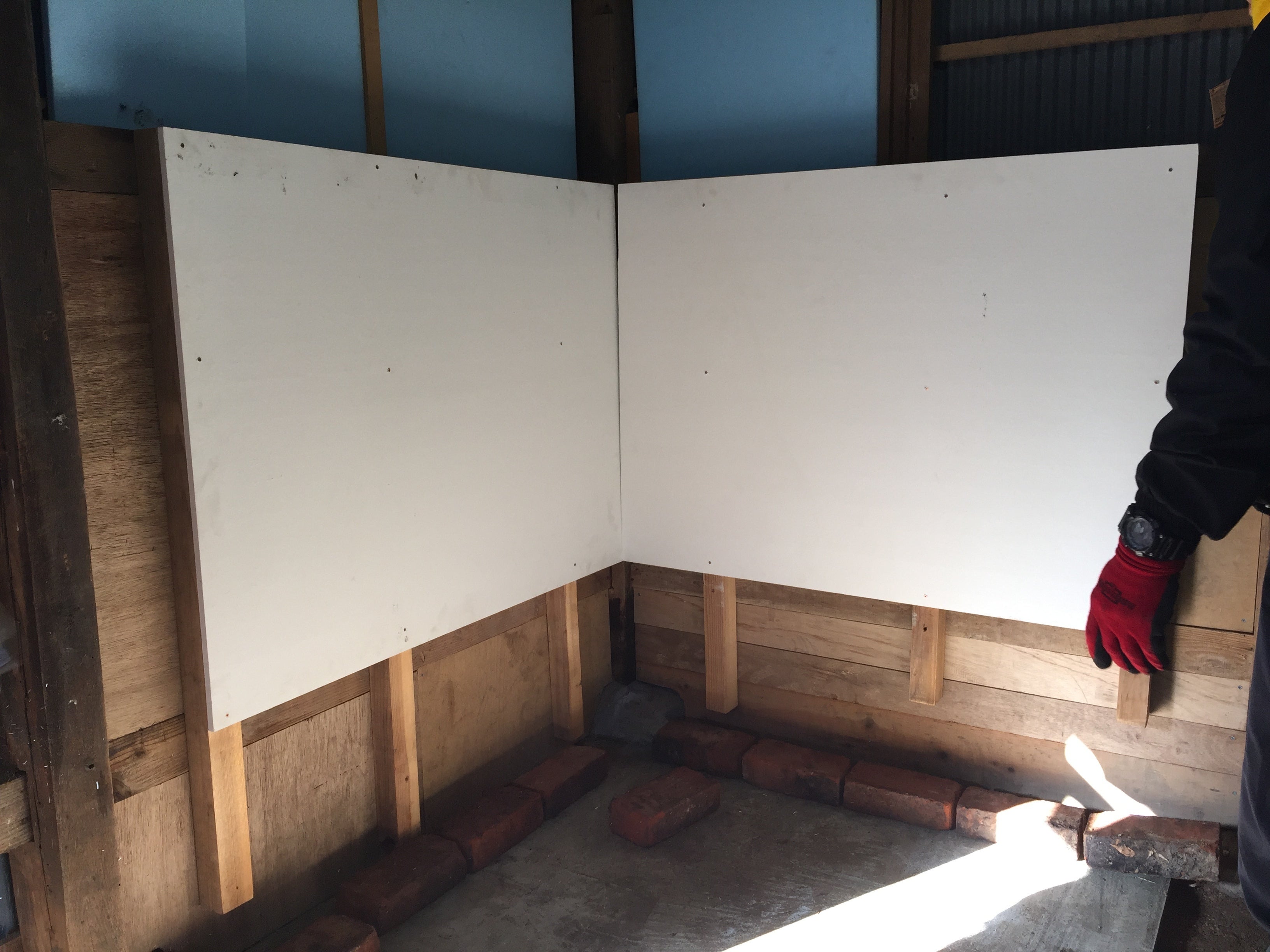 このケイカル板を、丸のこで切断したのですが、その時の白いモヤのような埃がすごいのなんの…!ホームセンターで切れたら便利なのに〜。(←頼んだら断られた)