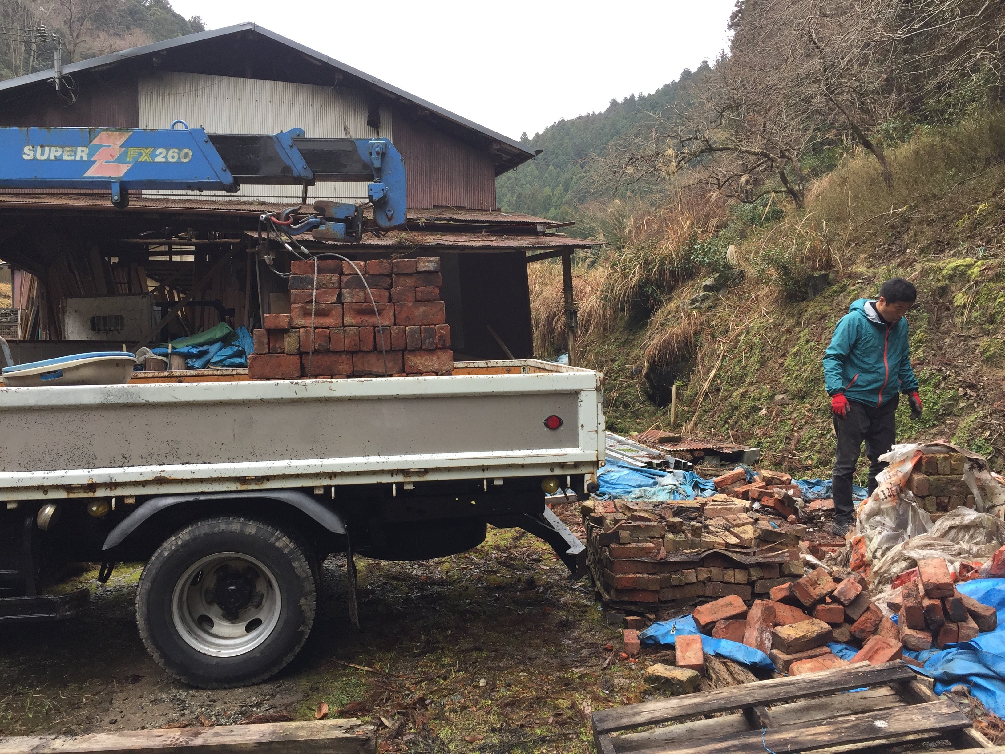 使用するレンガは、大西親方のご紹介で、素晴らしい風合いのアンティークレンガをいただくことができました。ひとつひとつ、積み上げて運び込みます。大きなトラックはクレーン付き。大西親方のご協力で1回で運び終えることができました。
