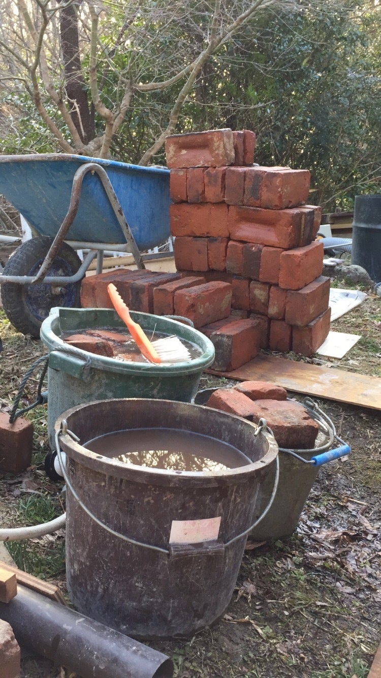 いや〜、レンガって、重いんですね〜!300個ほどのレンガを運んで良い筋トレになりました;