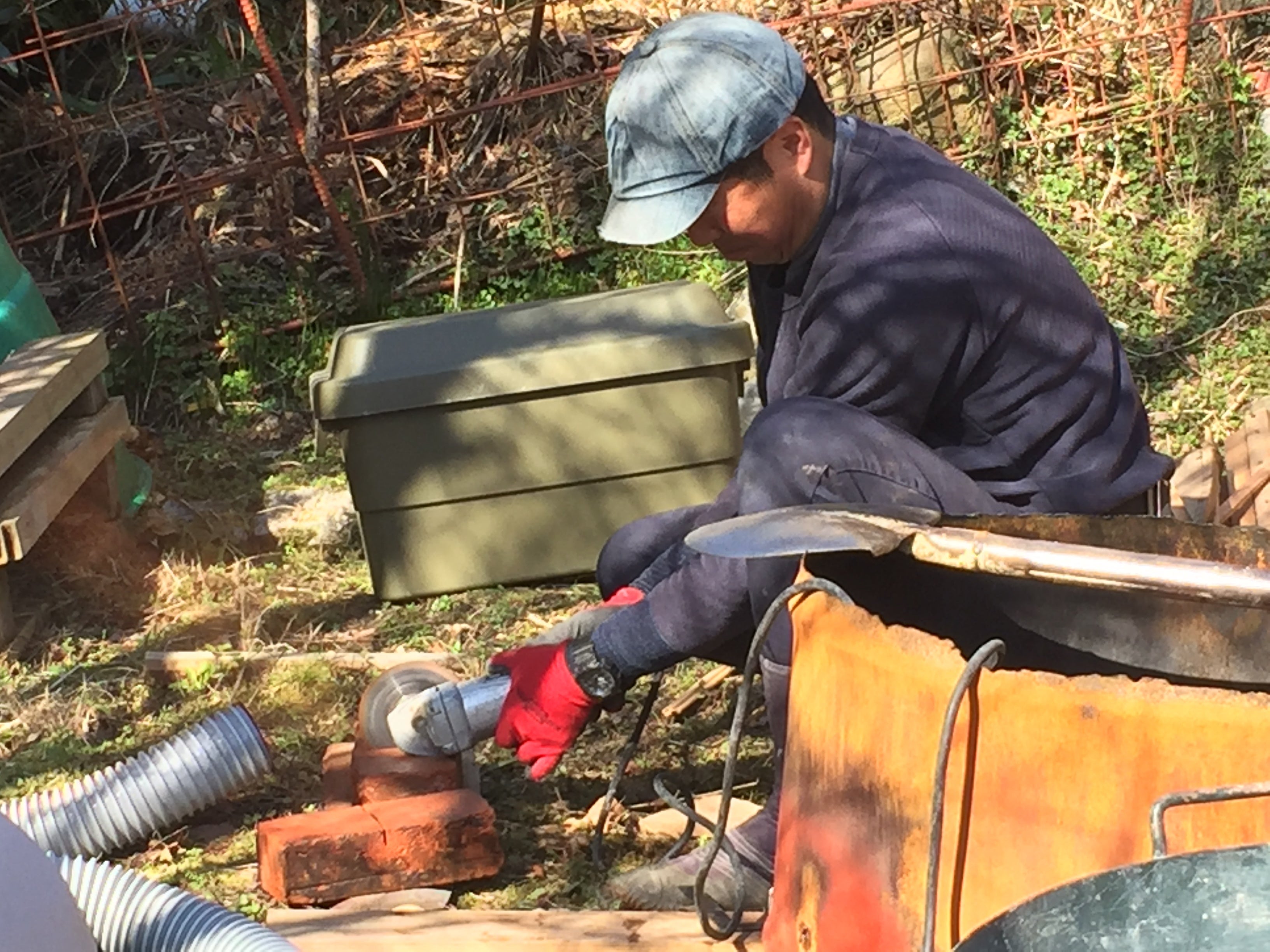 その作業がとても危険!ちゃんとした道具がないとできないことです。カットをするディスクグラインダーと、切るときに飛び散る破片などの集塵機など。