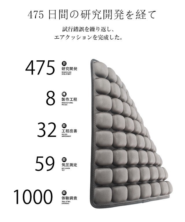 そこで私たちは、8時間座っても快適、楽々で、正しい姿勢を維持し、お尻にフィットする3Dエアクッションを開発しました!