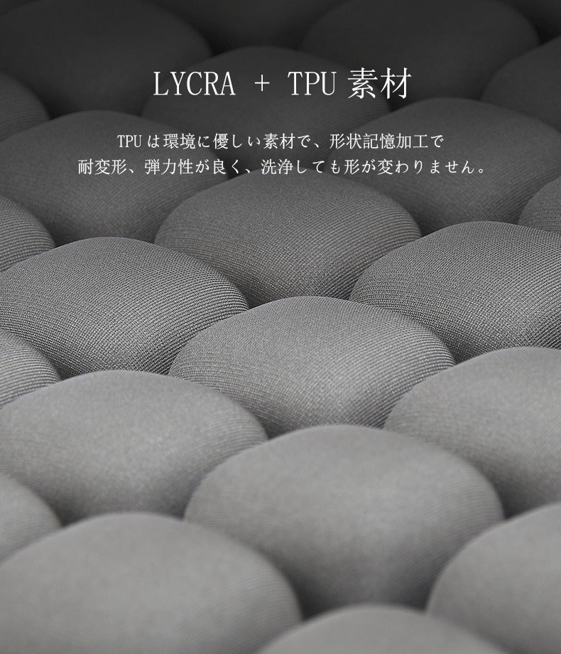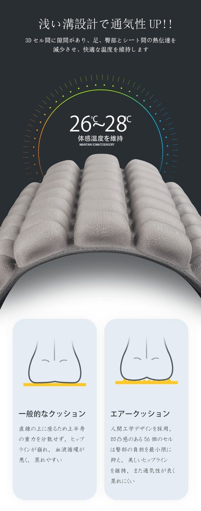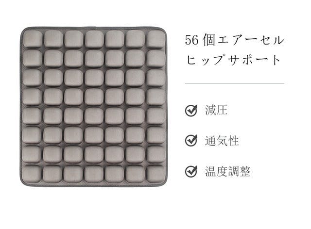 56個の立体エアセル、ラップアラウンド耐荷重方式で、座るとエアバッグ内で空気が均一に行き渡り、座る際のお尻に掛かるストレスを軽減します。