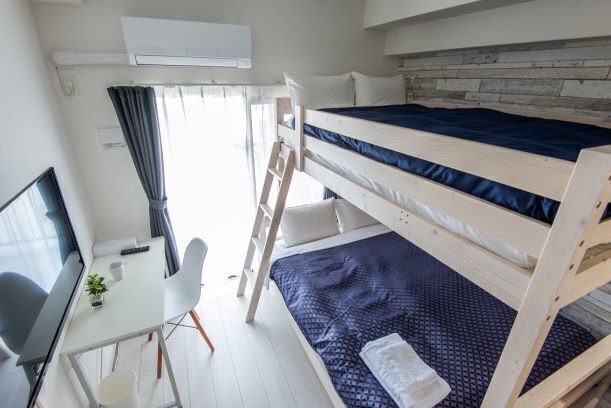 ダブルサイズの2段ベッドでは、グループやご家族が最大4名1室に泊まることができます。