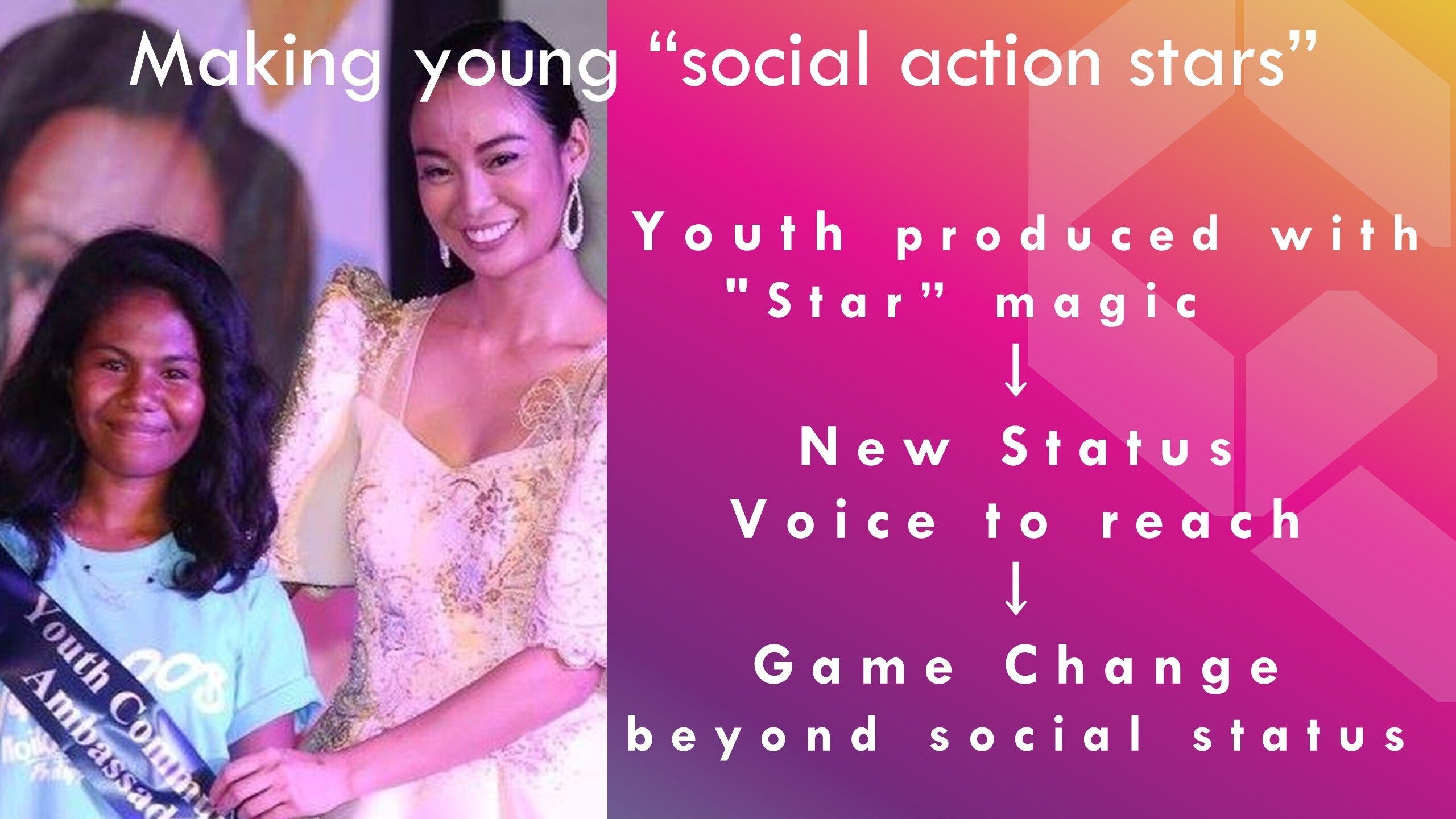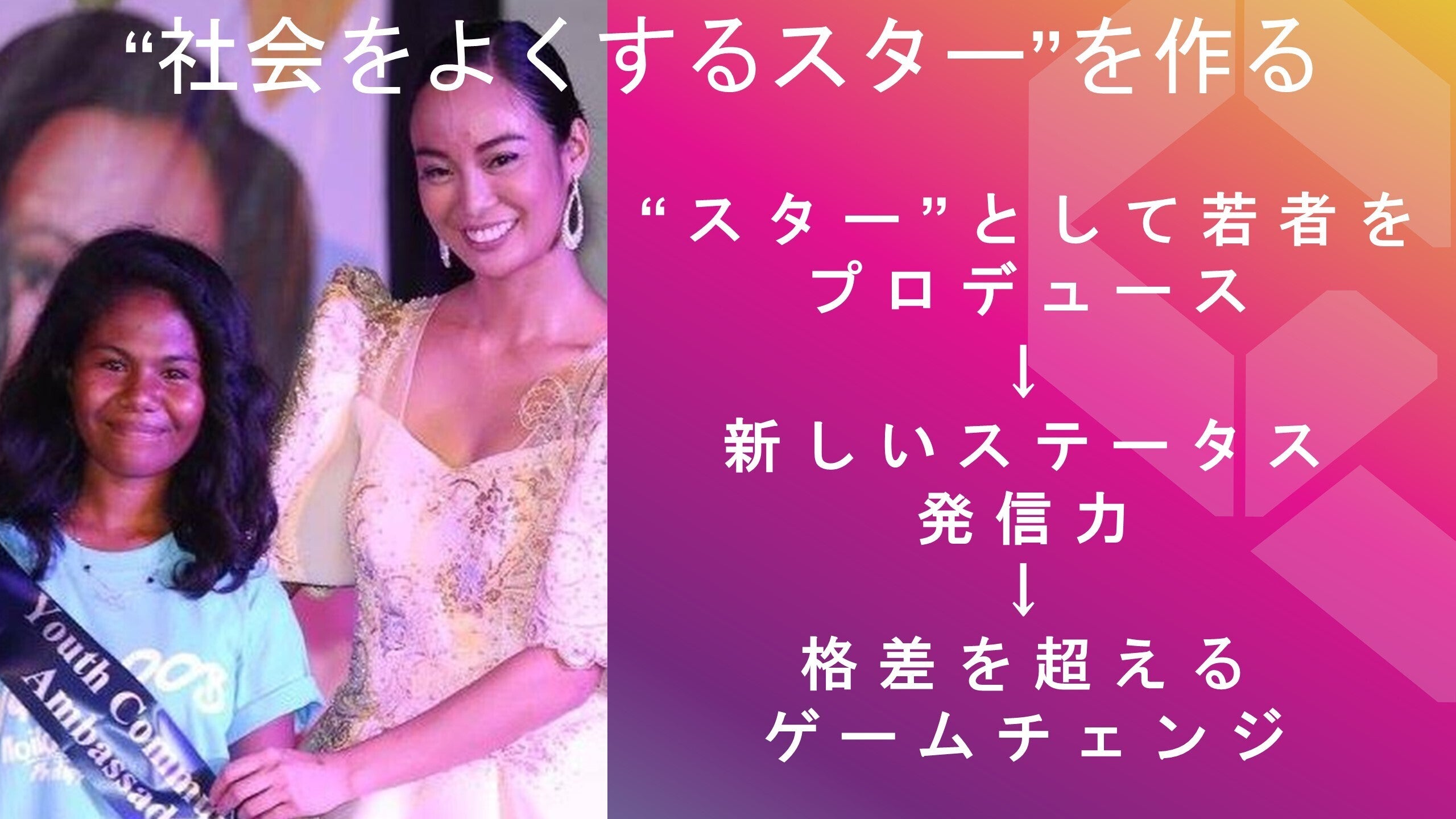 プログラムデザインのヒントとなったのは、私自身が経験したミスコンテスト(ページェント)です。コンテスト出場者は普通の女の子たちで中には母国では水や電気が整わない生活をする子もいますが、ミスと呼ばれた瞬間に嘘のようにすごい人扱いされ、写真やサインに応じれば子供たちは大興奮し、オピニオンリーダーとして政治家の方とお会いしたりメディアに発言を求められたりします。