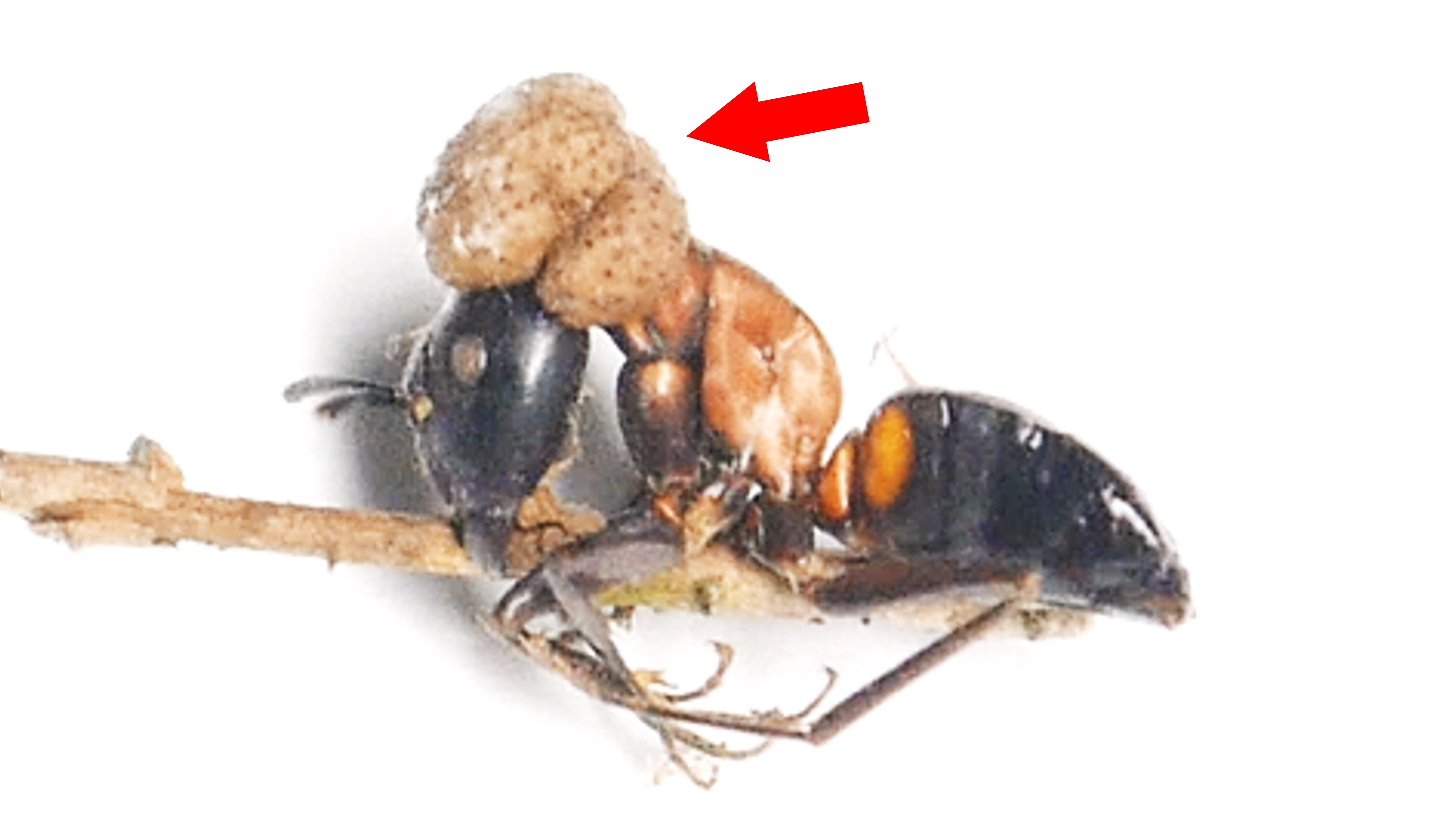 ◆アリに寄生したキノコ.2006年に新種として発見された「コブガタアリタケ」.