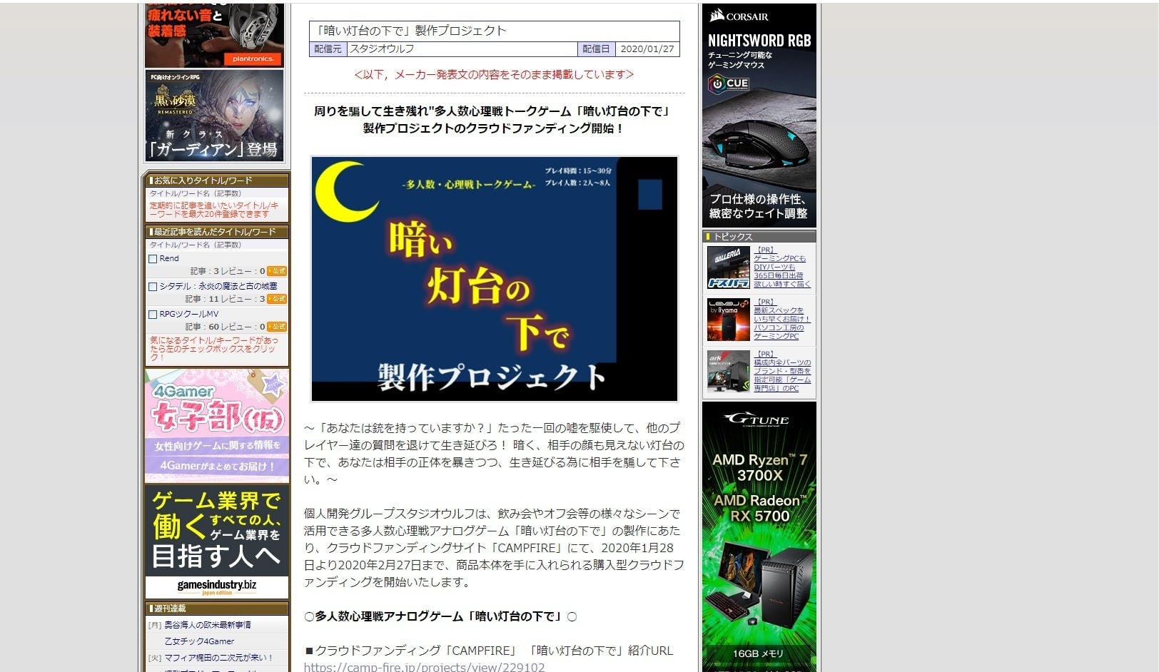 現在、クラウドファンディングとしてプロジェクトを開始させて頂いている多人数心理アナログトークゲーム「暗い灯台の下で」を総合ゲーム情報サイト「4gamer.net」様に掲載して頂きました!