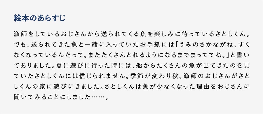 だからこそ今、小学校低学年の子どもたちが消費の主役になっていく20年後に向けて、日本の海を取り巻く環境について理解を深められるような絵本を制作していきます。