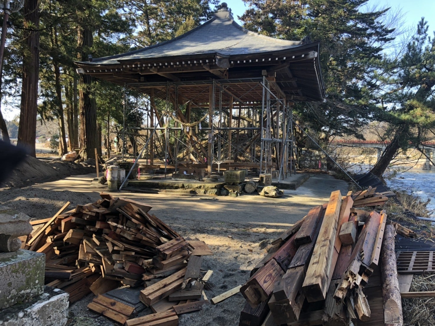 昨年10月の台風19号により被災した時は、屋根と柱1本を残し全て流されてしまいました。阿武隈川の水が引いた翌日から、被災住宅等の復旧活動の合間に、滝見不動堂を管理する竜崎地区の住民や氏子さん達が、阿武隈川周辺を捜索しお賽銭箱や木札等が次々と見つかりましたが、肝心の「弘法大師が彫ったとされるご本尊」は行方不明のままでした。しかし先日の1月23日にお隣の須賀川市の畑から発見され、無事にご本尊が引き渡されました。