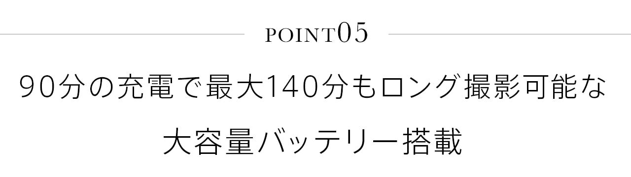 フル充電までわずか90分ながら、最長140分もの動画撮影が可能。