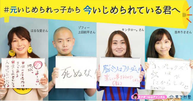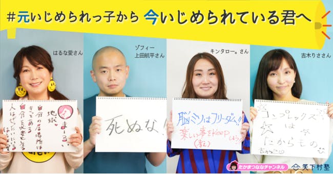 そこで私は、生きづらさを抱える人たちのため、テレビで活躍する芸人さんや著名人の方に、#元いじめられっ子から今いじめられている君へ と題したプロジェクトとしてYouTubeたかまつななチャンネルでインタビューをさせていただきました。