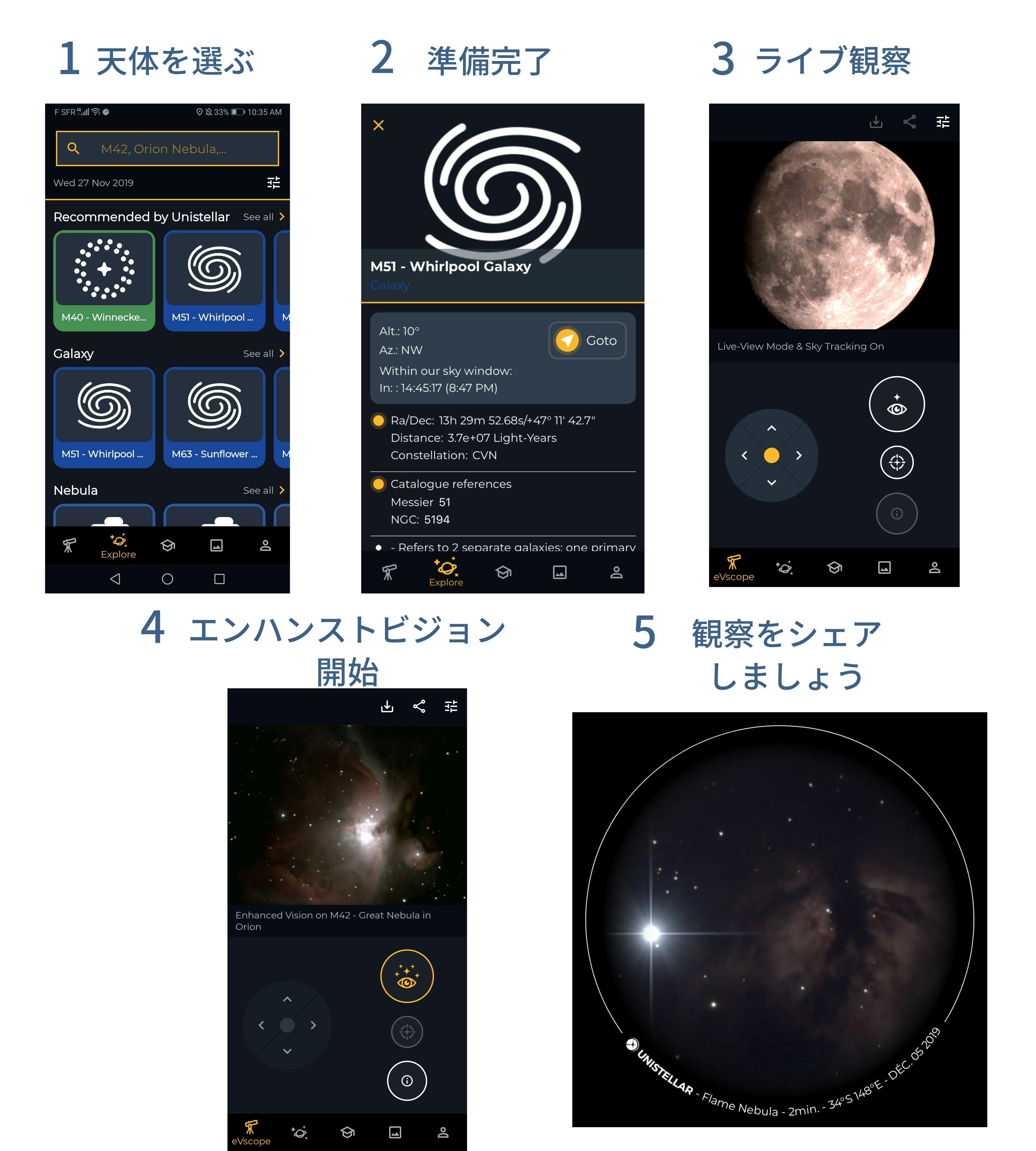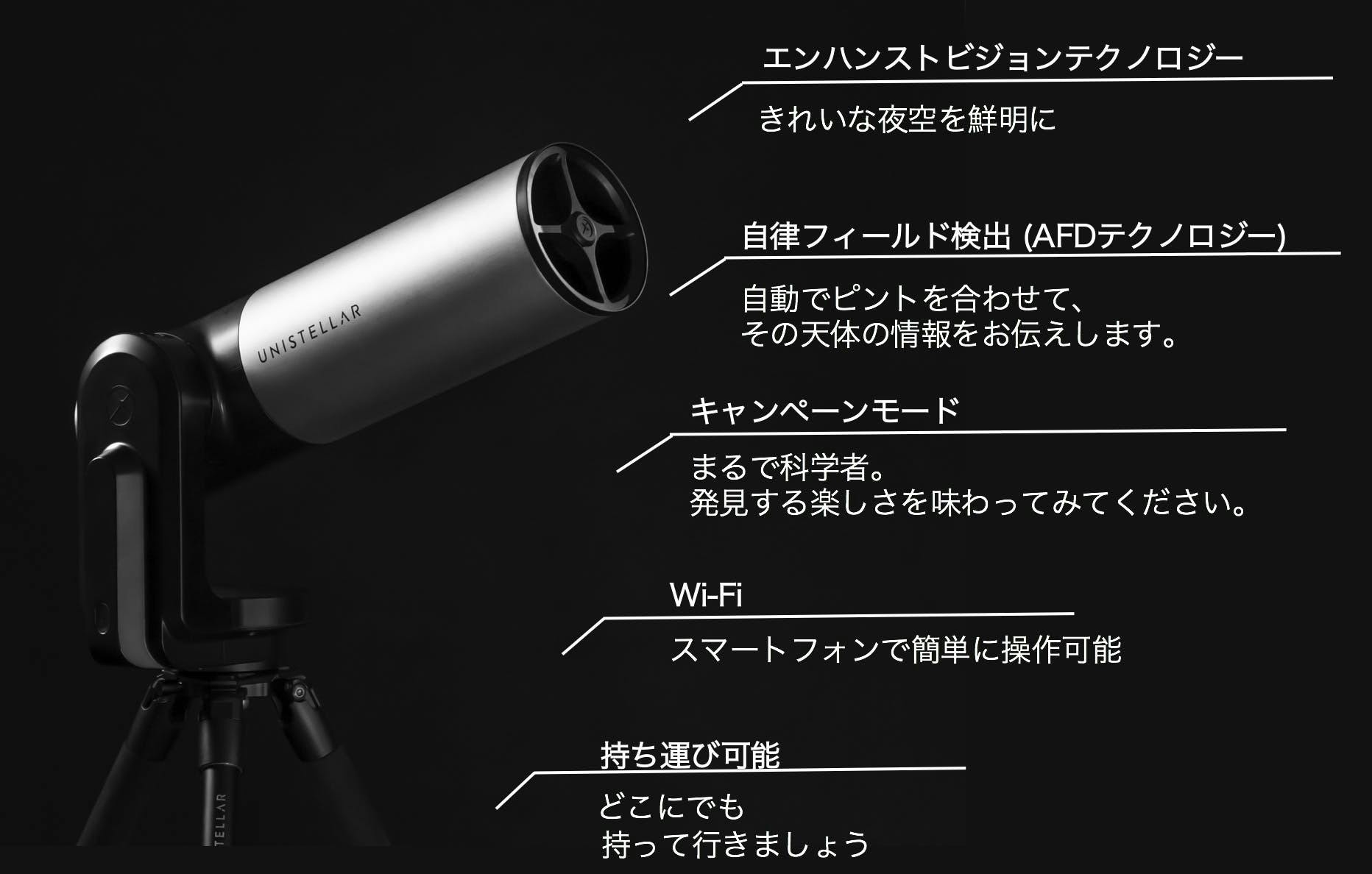UnistellarのEnhanced Vision (エンハンストビジョン)は小さい光もピックアップするソニーによる超高感度センサーを使用し短い時間で光を蓄積させる技術と独自に開発された望遠鏡内臓算出モジュールの画像処理アルゴリズムの二つの特許技術からなっています。