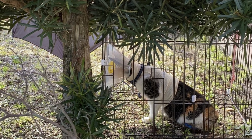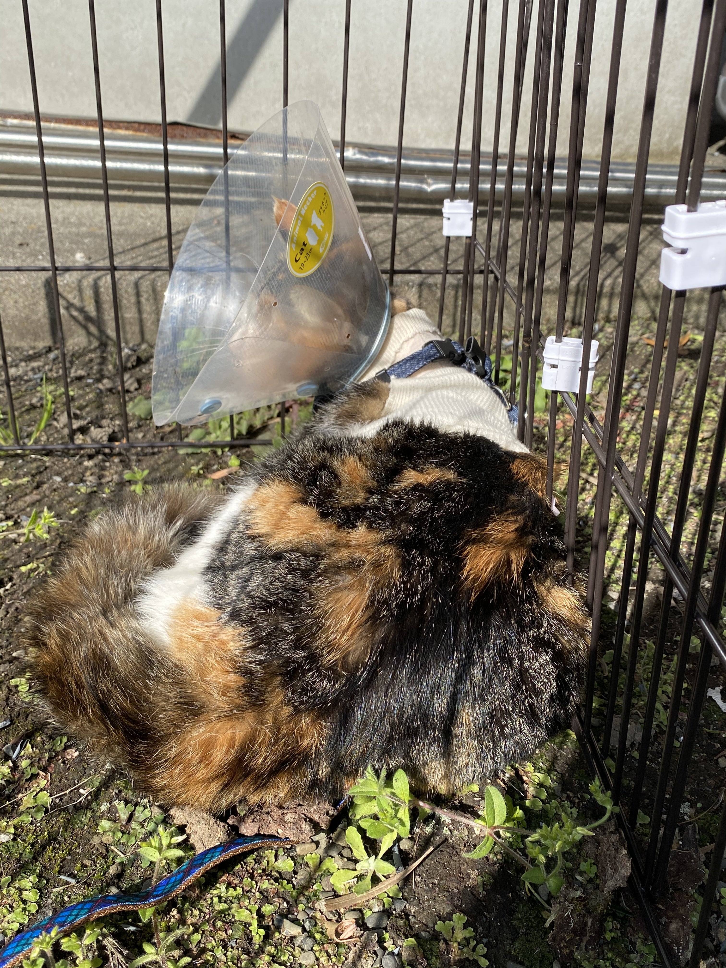 逃がしたら終わりだという覚悟で慎重にとのことで、首輪とリードを使用し、ケージを地面に設置して日向ぼっこさせました。
