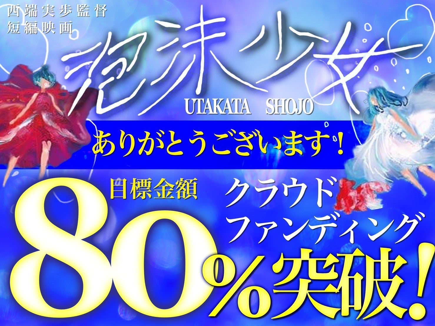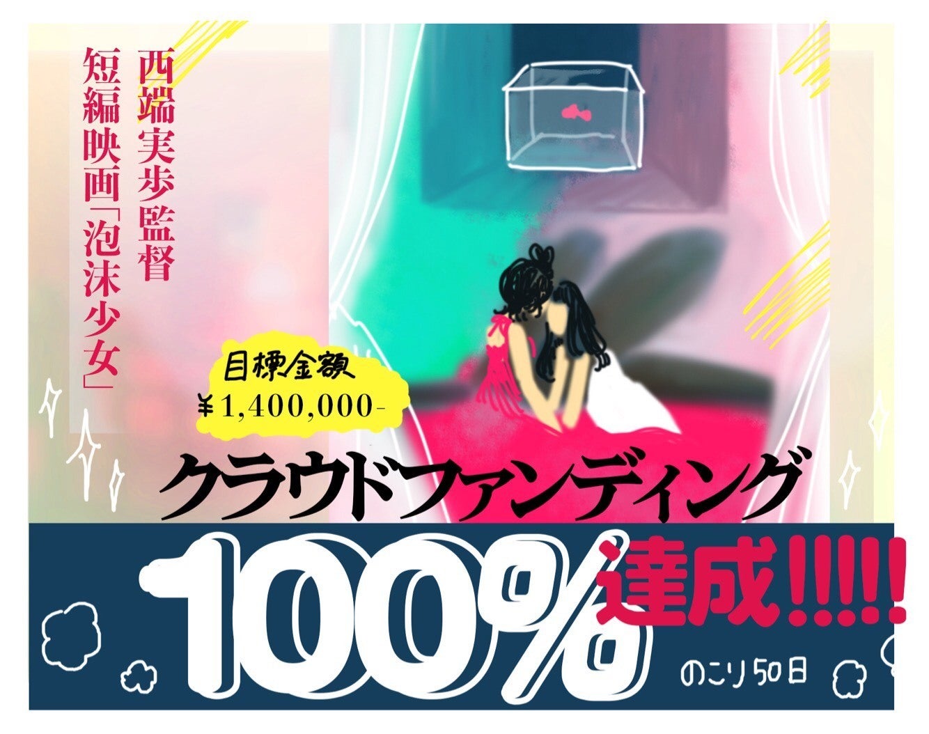 2/10 22:58「泡沫少女」クラファン5日目100%(140万)達成致しました!!!本当にありがとうございました(´;;`)!!!正直、始まる前は140万という数字は大きく感じていてものすごく不安でした直前までバタついたところもあり、それでも周りの方々に勇気を頂き、支えながら始めることが出来ました!!そして1日目、24時間で100万突破したときは、こんな早く達成出来ると想像しておらず、言葉が出ないぐらい、嬉しかったです!!!ここで達成が見えた時にこれでかなり夢に、世界に近づける!!!と確信することが出来ましたこれからは、更なる夢を広げるために、第2の目標を掲げ、目指していこうと思います!応援してくださる皆さん本当に本当にありがとうございました!!!私たちは更なる目標に向け挑戦し続けます