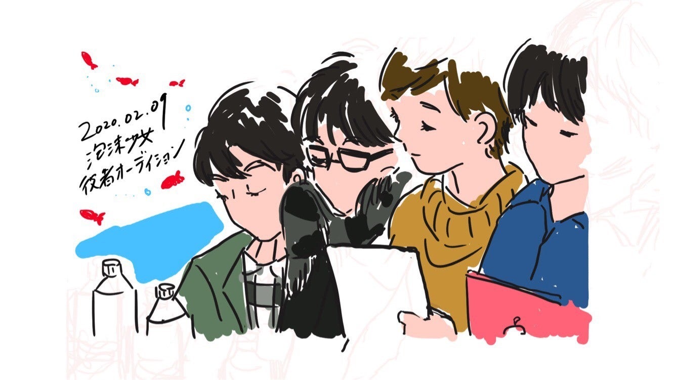 『泡沫少女』メイキング日記2/9 オーディション。△事前打ち合わせの様子緊張感。支配する空気はそれで間違いない。なんせここはオーディションの現場。監督と役者の真剣勝負の場、しかもお互いにとって初対面かつ一発勝負の場、なのだ。役に応募した理由、課題演技、ダンス、そのひと通りを終えて最後にもう一度監督と役者が互いに感じたことを聞き、応える。オーディションは終始そんな流れで進む。でも不思議なのが、ピリッとしたとか、ピーンと空気が張り詰めたとか、そういった空気でもない。やってくる役者は当然緊張している。なにより、西端監督が緊張している。でもなんというか、緊張の角が丸い。「オーディションをやるのも初めてだし、どんな質問をしたらいいのか。役者の能力を引き出すために、どう振る舞えばいいのか」監督はオーディション前にそんなことを言っていた。初めての100%自分主導で進める映画制作。しかもこの場だけで10人以上のクリエイターがスタッフとして集まっている。たくさんの人を巻き込みながら進む、大きなプロジェクトなのだ。きっと不安もたくさんあるんだろう。ただ、そこはやっぱりプロだった。最初の質疑応答は監督も役者も緊張気味。でも、役者は課題演技に入るとスッと自分の世界に入っていく。そして監督もまた、その役者の姿を見て目が変わる。勝負師の目となる。お互いがお互いの役に徹する。文字にすればプロフェッショナルな空間。しかも、極上なプロフェッショナル。最初、緊張の角が丸いのは西端監督の人柄によるんだろうと、ありがちな形で片付けようとしていた。たしかにそれもあると思う。でも、何組か立ち会って感じるようになってきた。それまで、オーディションとは「お互いの能力をぶつけ合うもの」と思っていた。でもどうやら、それは違った。お互いを理解し合おうとする場、なんだ。だから緊張感はぶつかり合うけど、お互い削り合うことはしない。プロ同士がリスペクトを持って対峙する場。だから生まれる丸い緊張感。清々しいこの空気こそオーディションの本質、醍醐味なのかもしれない。さあ、いよいよ映画づくりが始まった。(取材:大竹一平)(イラスト:山中千尋)
