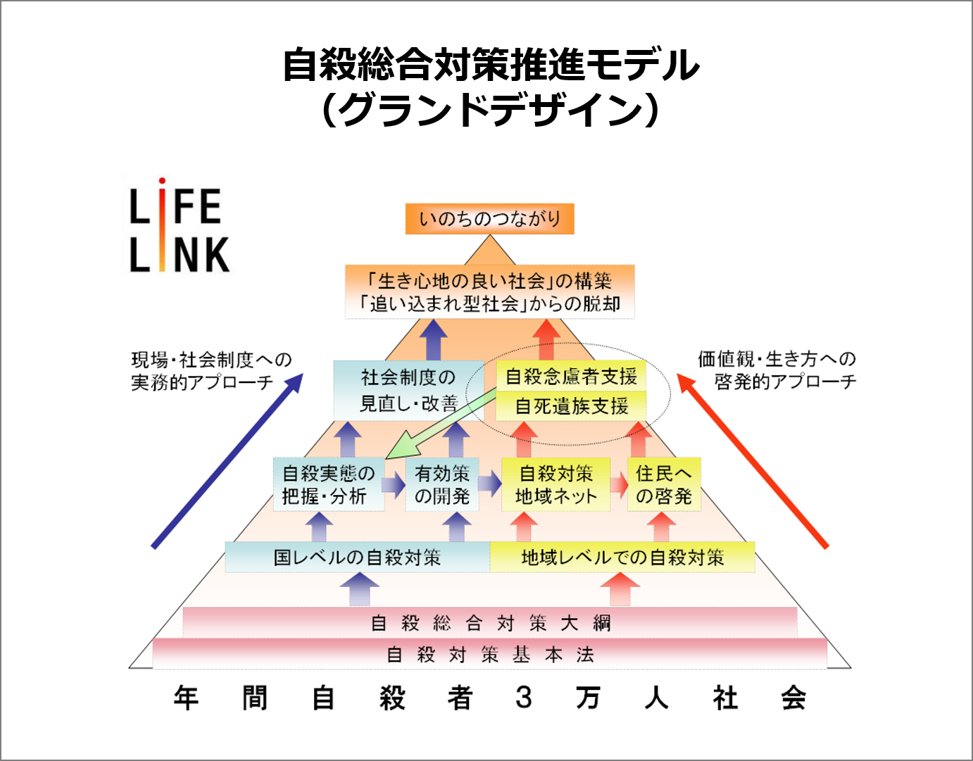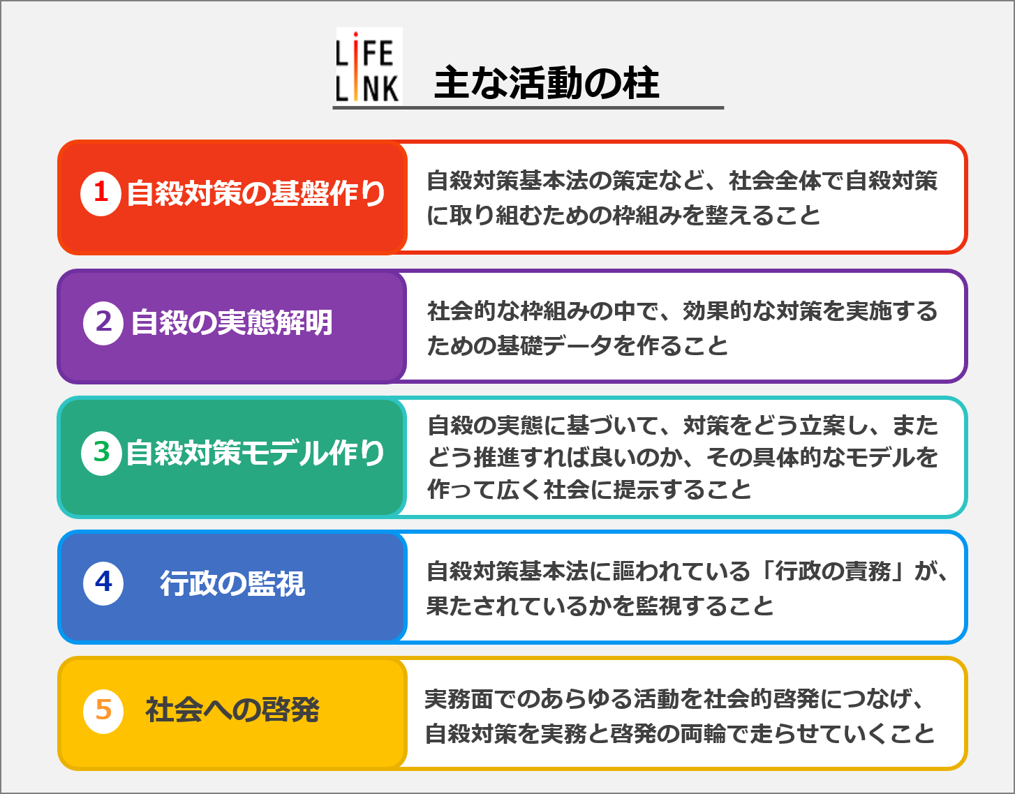 つまり、①自殺対策の社会的基盤を作り、②自殺の実態を解明することで、その基盤の中でやるべき対策を明らかにする。そして、③明らかとなった対策をどう実践すればよいのか、具体的なモデルを作って提示し、④そうしたモデルに従って、行政が自殺対策に取り組んでいるかどうかを監視する。また、⑤すべての活動を社会的な啓発につなげることで、あらゆる実務的な活動が根付きやすくなるように自殺対策の土壌を耕す。そうやって、自殺総合対策を自律的な安定軌道に乗せていくというのが、ライフリンクの活動戦略です。