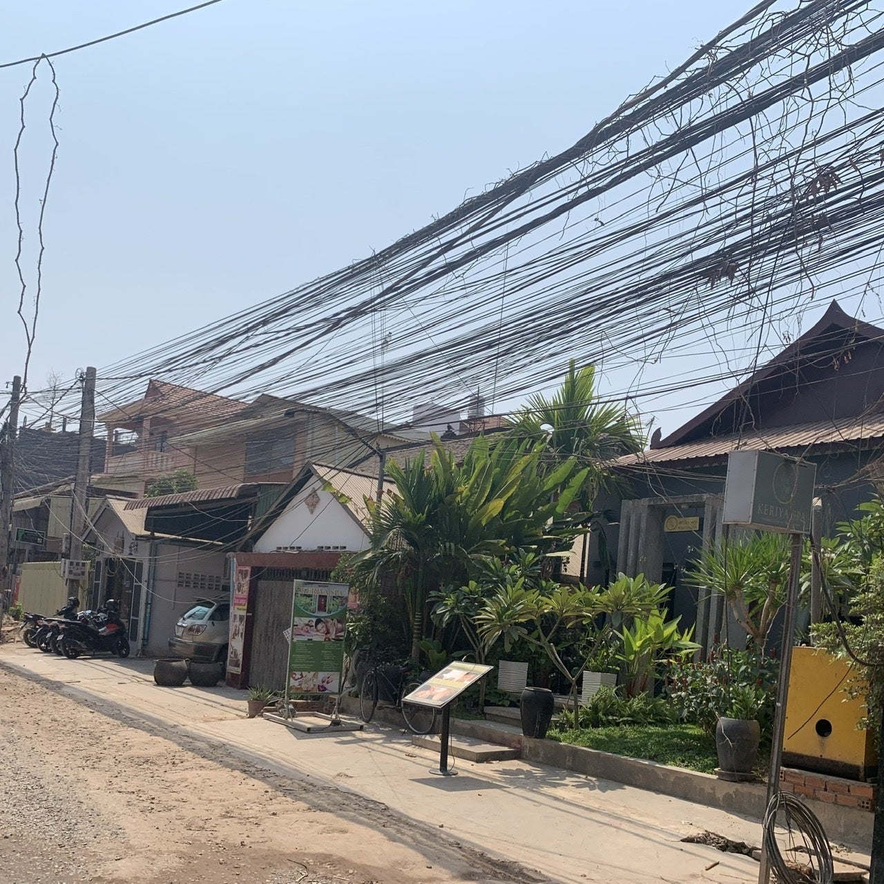 シェムリアップはこうゆう舗装されてないところが結構あります。こんな風に電線やば過ぎるとこがあったり、