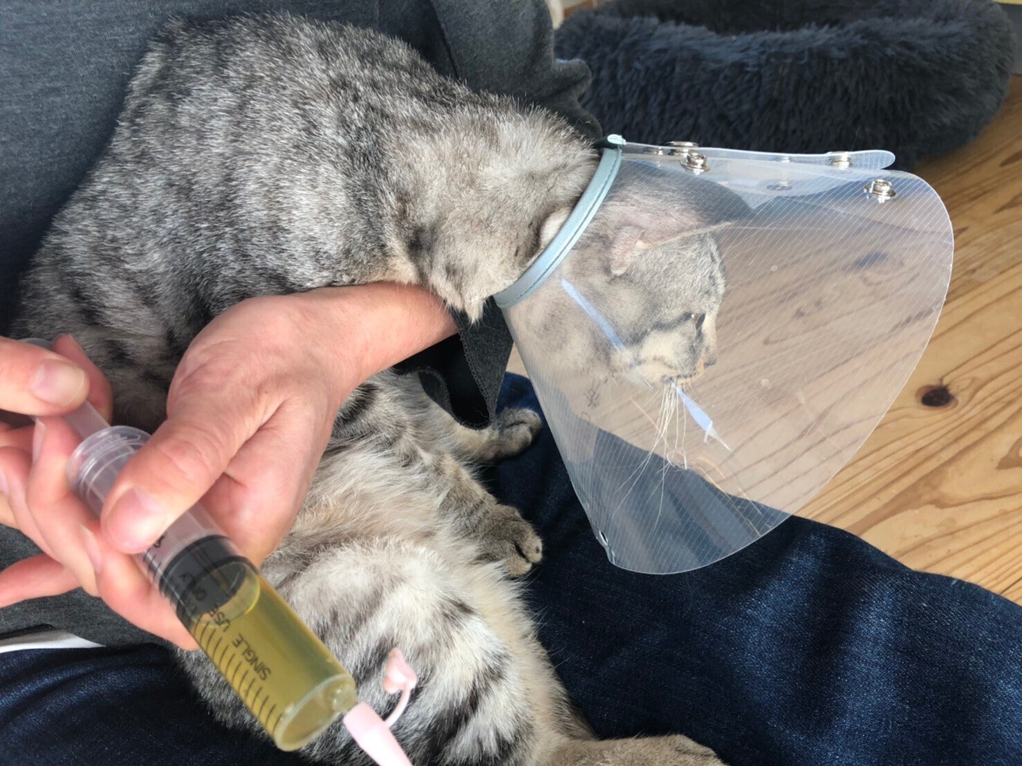 退院した日の夕方オシッコを注射器で抜こうと猫部屋を見に行ったら、カテーテルが抜けている!!エリザベスを付けていたのに!かかりつけの病院へ行き再度カテーテルを入れてもらいました。やんちゃ復活です。少し長めのエリザベスに変更。