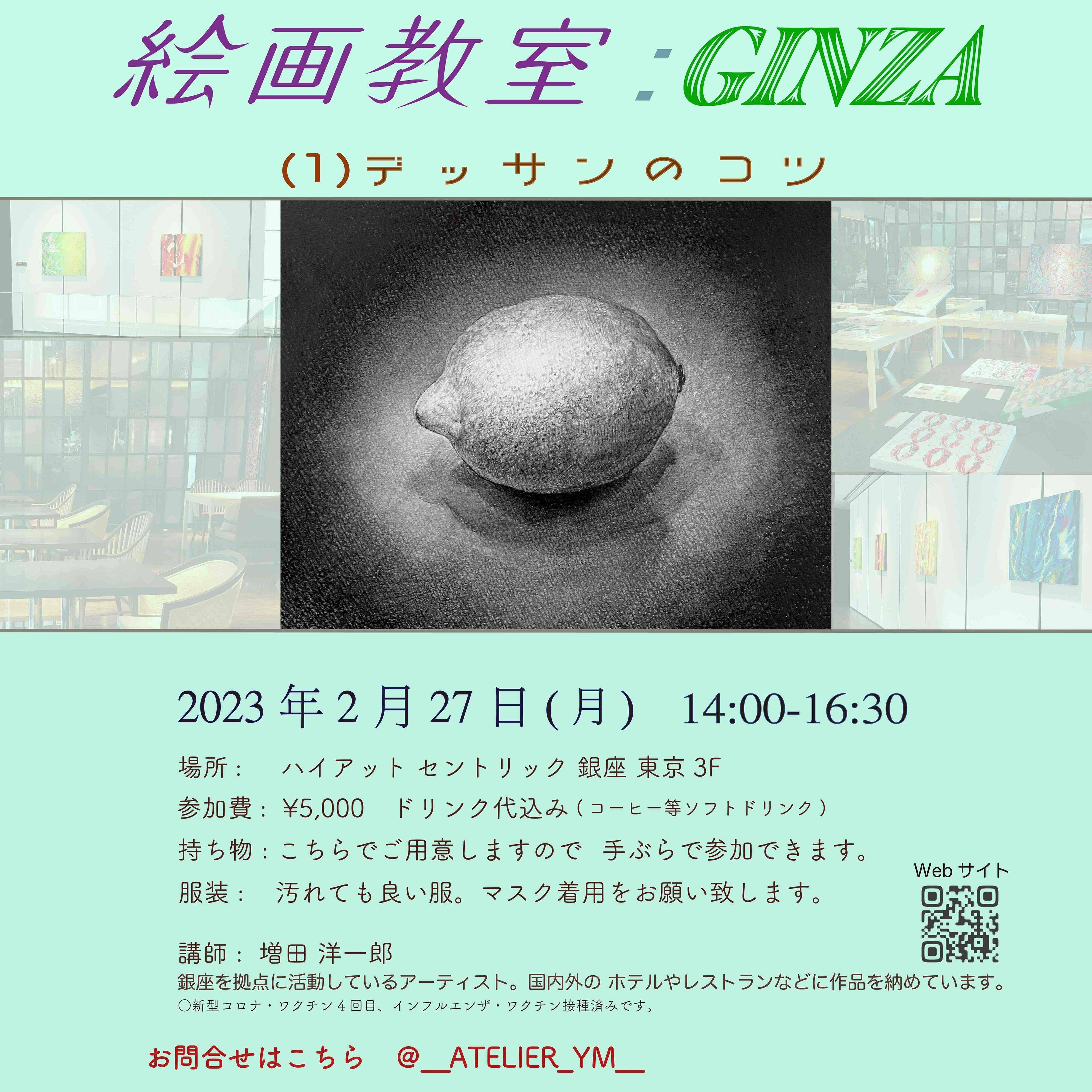 2023/02/24 10:00支援者の皆様おはようございます。茨城県 結城市での絵画教室は3月で3回目を迎えます。そして......、東京でも絵画教室を開きます。場所は銀座 並木通りにある「ハイアット セントリック 銀座 東京」です。こちらは 私が2019年に個展を開いたホテルで、支配人、スタッフの皆様、インテリアもモダンなホテルです。朝日新聞社の跡地に建っており、当時、夏目漱石が務めていた場所でもあります。新聞や活字をモチーフにしたインテリアが特徴の素敵な空間、3階奥のレストランのテーブルをお借りして、絵画教室を開きます。東京での第1回も「レモン」をモチーフにした鉛筆デッサンです。デッサンは形を捉える事や、空間の把握、3次元から2次元への描き換えなど、日頃 使わない部分の頭を使うので脳がほぐれて気分転換になります。描いた後はホテルのソフトドリンクを飲みながら、絵を見て振り返りをします。平日の昼過ぎなので、ご参加難しいかもしれませんが、お時間ある方は是非ご参加下さい。道具はこちらでご用意しますので手ぶらで参加して頂けます。明後日(27日)の開催、まだ空きがあります。お気軽に問い合わせ下さい↓ ※モチーフや道具があるので 事前にお申し込み下さい。yoichiro629masuda@gmail.com2023年2月27日 月曜 14:00-16:30場所:ハイアットセントリック 銀座 東京 3階参加費:¥5,000 ドリンク代込み持ち物:なし。鉛筆しか使いませんが、一応、汚れても良い服でお越し下さい。マスク着用をお願い致します。 もっと見る