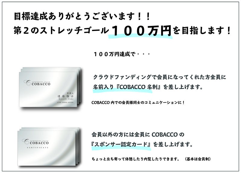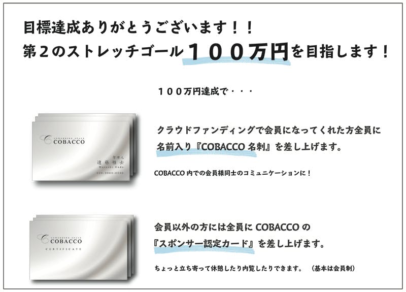2020/03/16 23:03昨日まで開催しておりました、当プロジェクトですが、達成というかたちで無事に終了致しました。58名様の方にご支援をいただき、本当にありがとうございました。期間中、何度も何度もSNSで発信していたため、不快に思われた方も中にはいらっしゃるかもしれません。そういった方々におきましてはご迷惑をおかけしてしまい申し訳ございませんでした。今回のクラウドファンディングにてご支援いただきました方々、また会社様におかれましては『支援者様一覧』としてCOBACCOのWEBサイトに掲載させていただきましたので、↓のリンクからご確認ください。▶スポンサーページ◀何度も確認は致しましたが、万が一記載漏れや誤字・脱字、リンクミスなどがございましたらお伝えください。その際は直ちに修正させていただきます。また、それぞれのリターンに関しましては明日以降、順番にメールでの対応をさせていただきますので、引き続き宜しくお願い致します。改めまして、この度は本当にありがとうございました! もっと見る