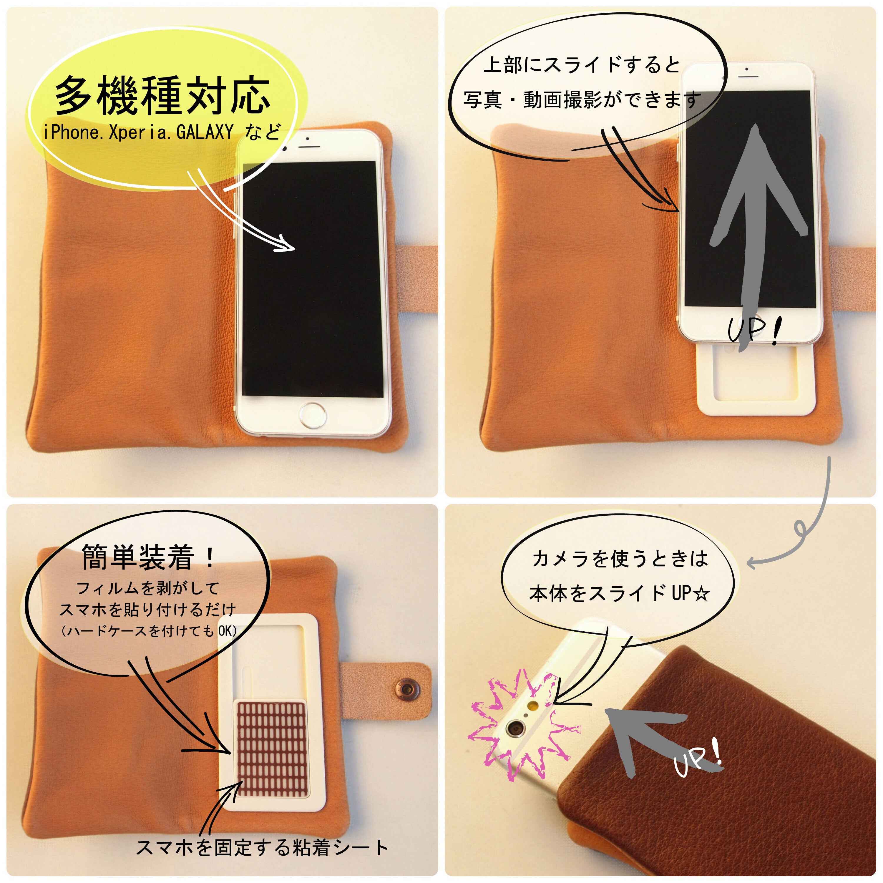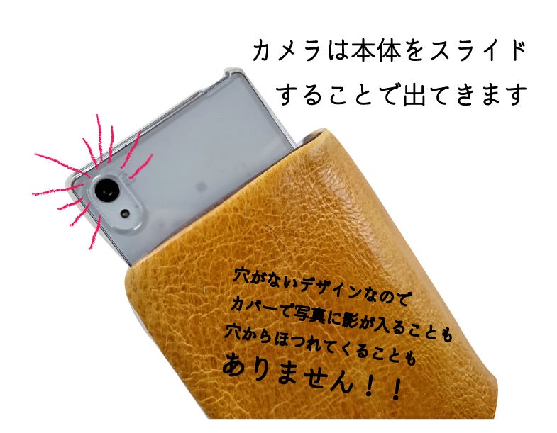 写真撮影時はスマホを上にスライドするだけ。市販のスマホケースなど、穴が開いているものは、写りこみや影になります。写真にこだわるのであれば、スライドがおすすめです。