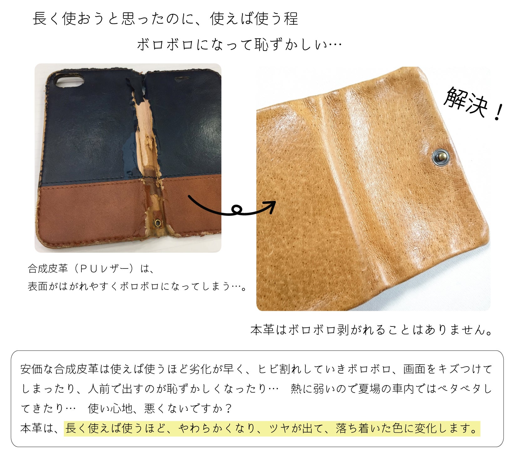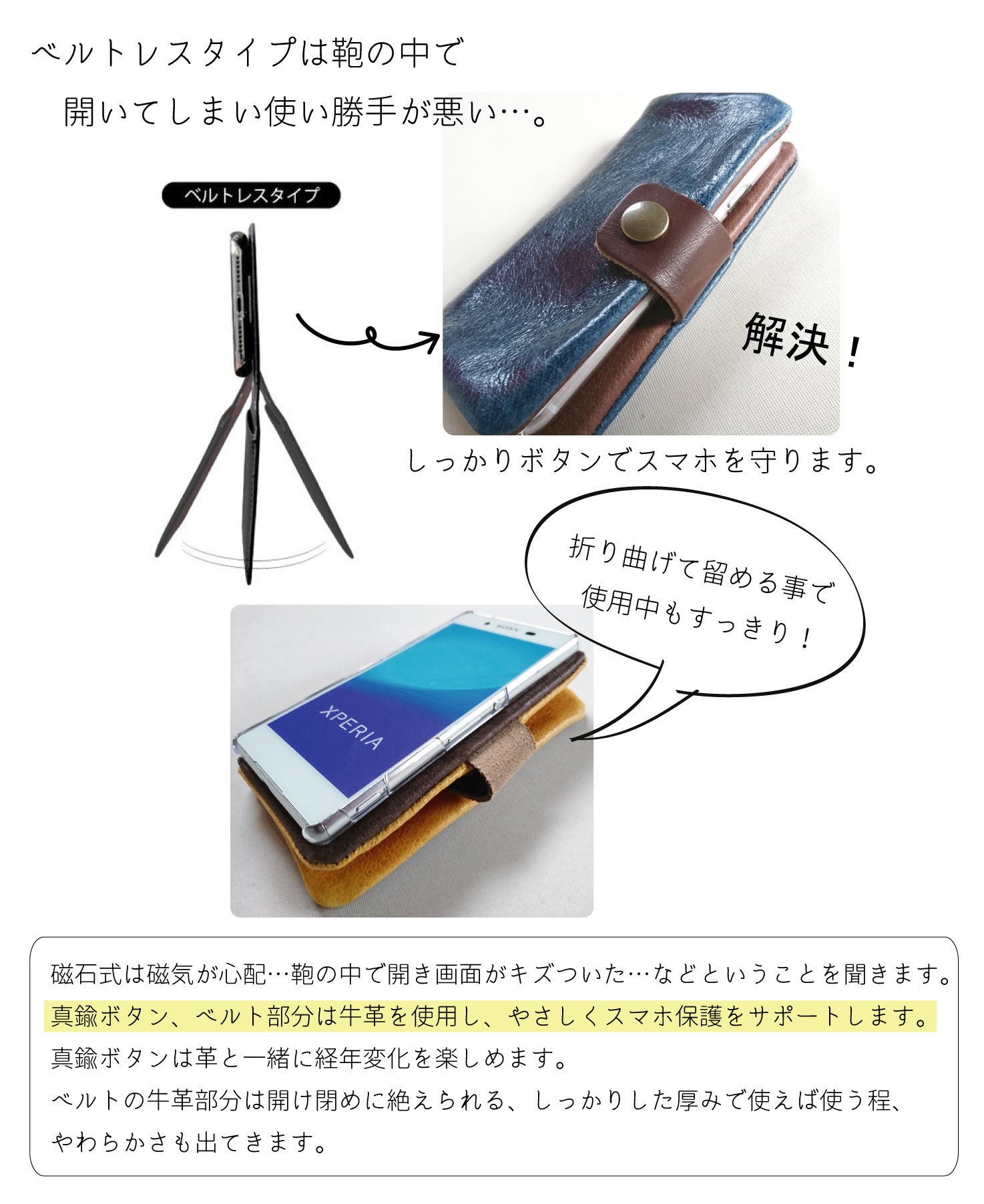 革らしさを楽しめる、飽きのこないシンプルデザインのスマホケースを提案いたします。
