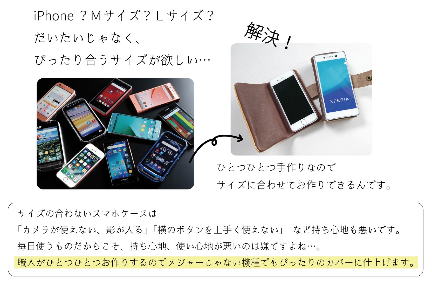 多くのスマートフォンに対応!今回はハードケースをお付けして、スマホサイズに合わせてお作りいたします。向いてない機種もございますので、以下の注意点をご確認ください。