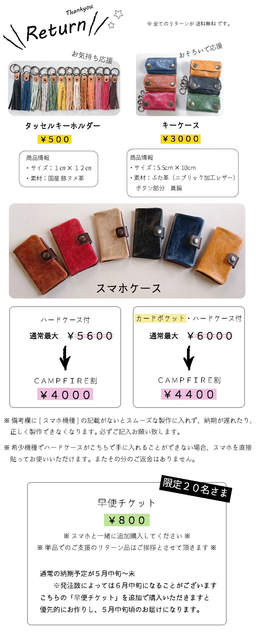 通常、大きいスマホケースの場合は、革材料費として追加代金をいただいておりますが、今回は追加代金なしでの一律料金の4000円にて承ります。これもCAMPFIREさんのおかげです。