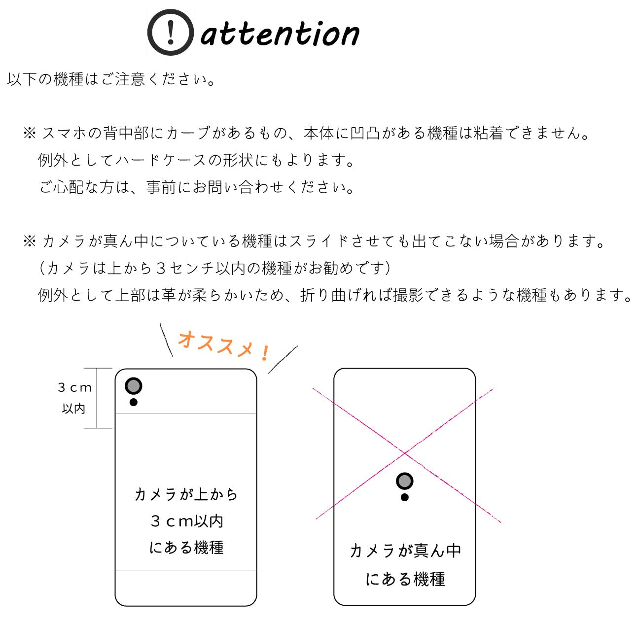 ※スライドは4cmです。機種によっては撮影できないこともあります。カメラが上から3cm以内のものがオススメです。スマホケース上部は革が柔らかなため、折り曲げれば撮影できるような機種もございます。