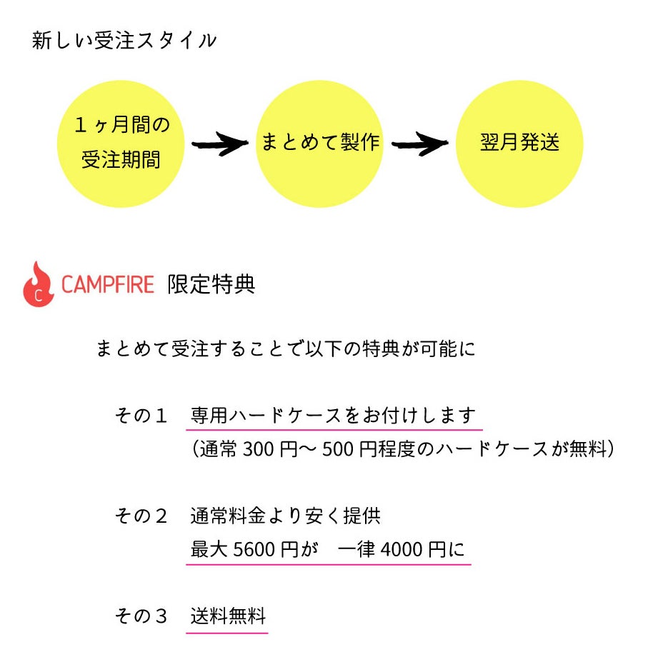 通常どんなお取引でも何かしらの手数料がかかるものです。間に仲介が入らない分、価格は安く。一か月分の、まとめて受注のため、さらに安く。今回はCAMPFIREに感謝を込めて、これまでのプロジェクトにて余った豚革での製作となりますので、さらにさらに安く。