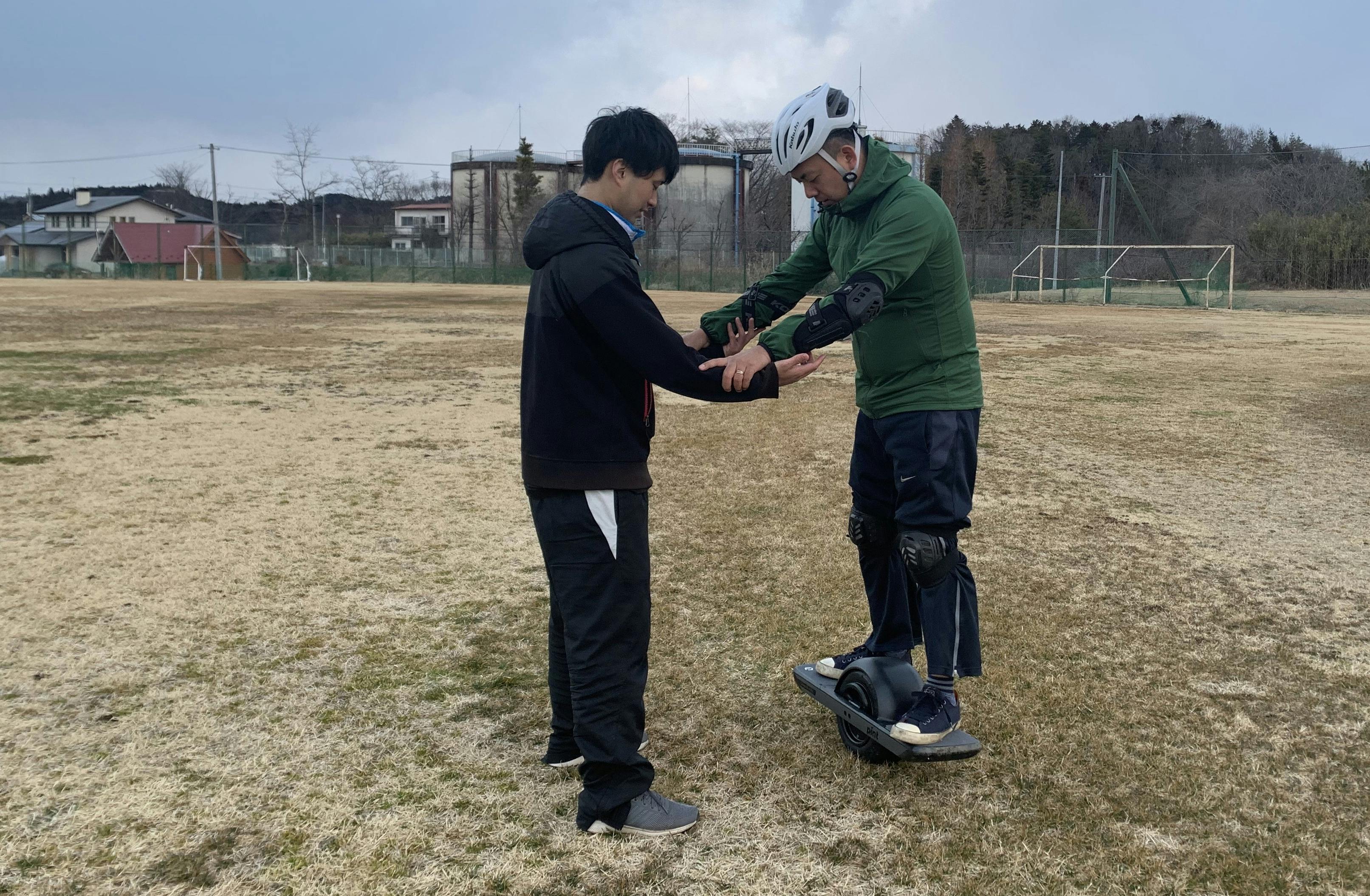 また、初心者の方でも始めやすいよう、10分程度のかんたんなトレーニングも無料で提供する予定です。写真では「スケートボードもスノーボードも経験なし。もちろん、時世代モビリティのワンホイールは初体験」というH本さんにテスターになってもらい初心者講習の実地テストを行っているところです。