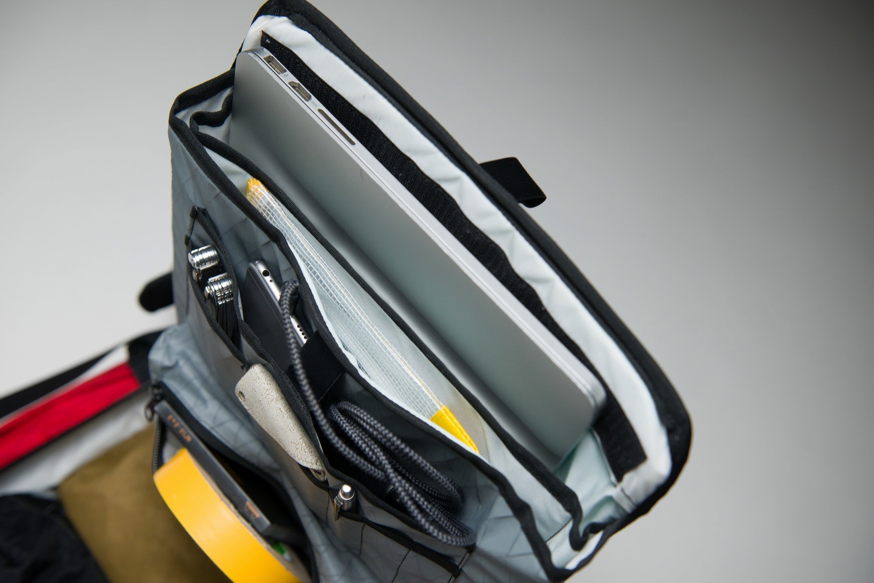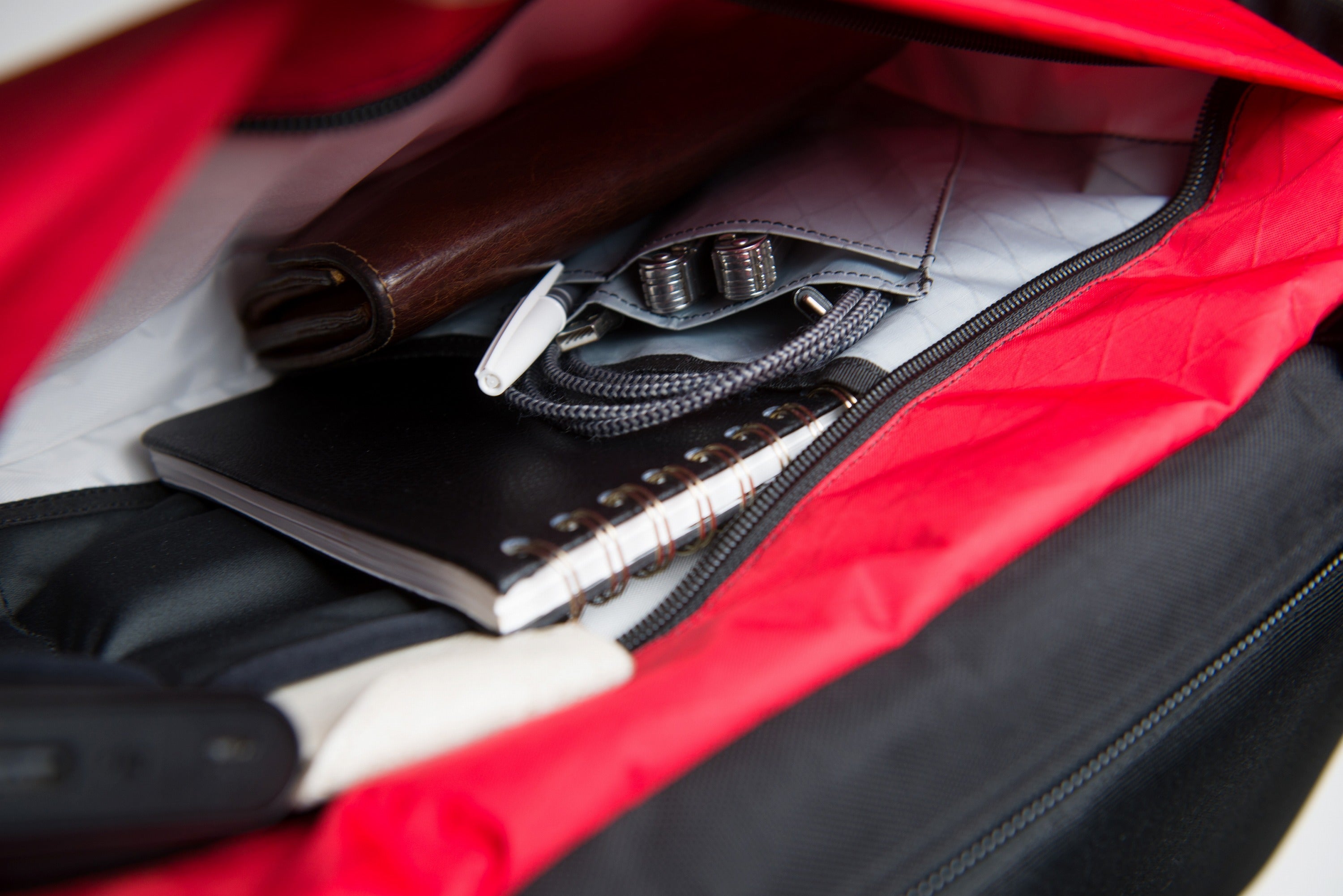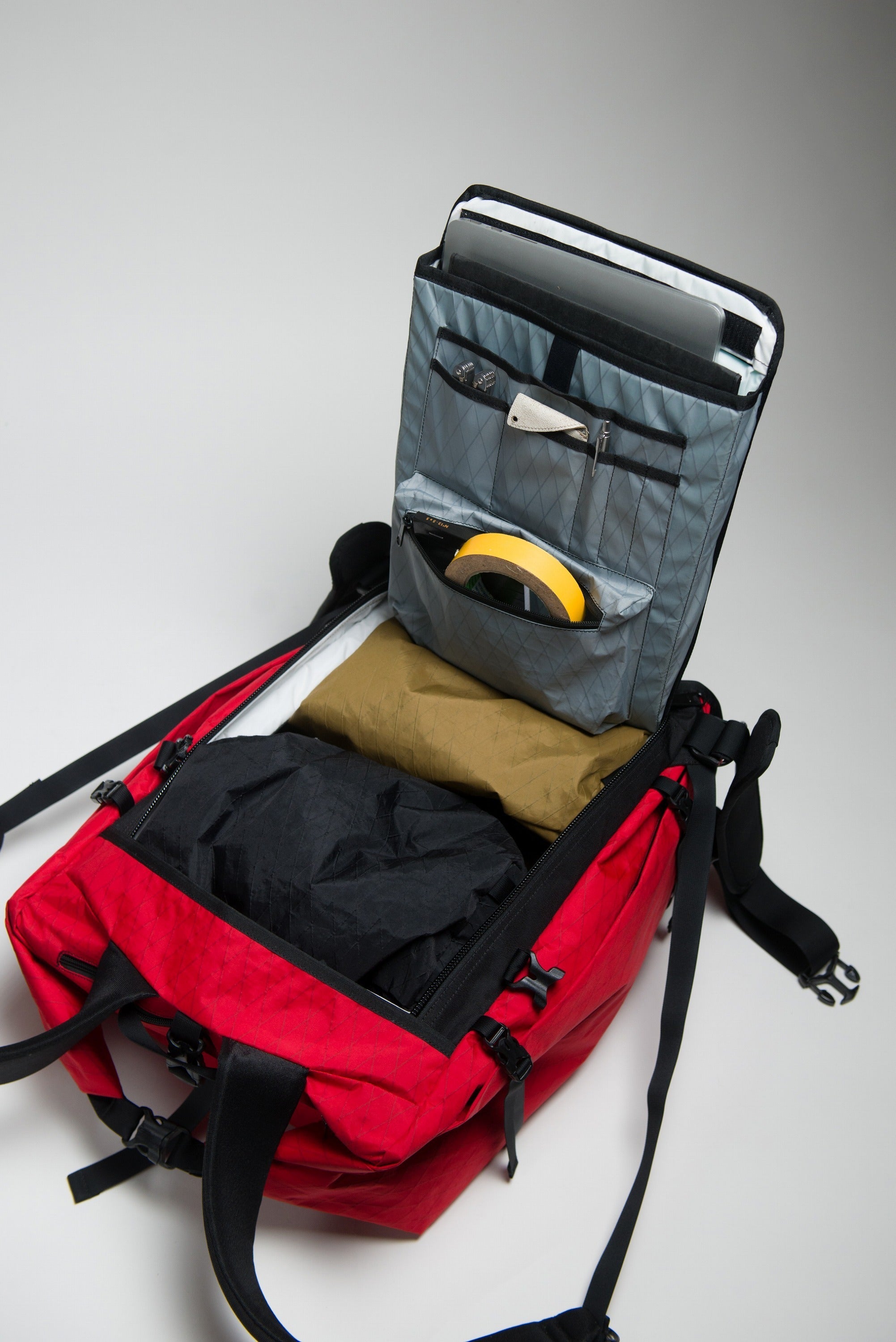 普段の街中での利用時は、背面のチャックから取り出すことが多いため、上の開閉口には、防寒具などの衣類や出張先の着替えなどを入れて、仕切り版で上下を仕切ることも可能です。
