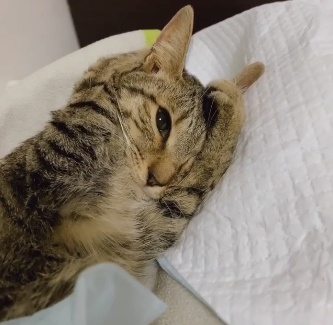昨晩から顔が小刻みに横揺れ。体がこわばり始め、足や体が丸まって硬直状態に。数分で何事もなかったように元に戻る。検査結果が出てFIPの陽性。医師からは治療法がないため安楽死を勧められる。