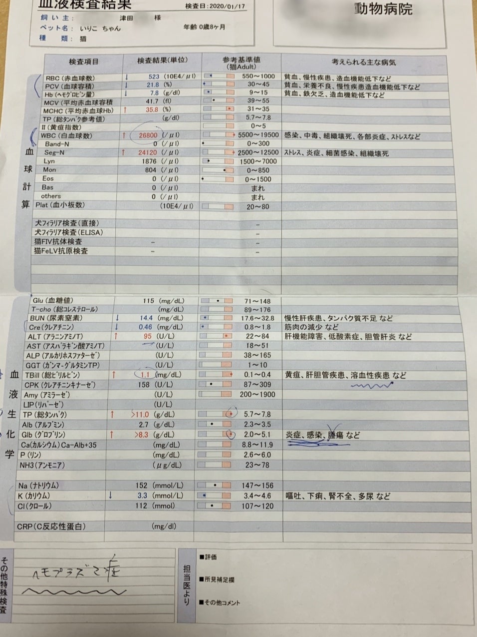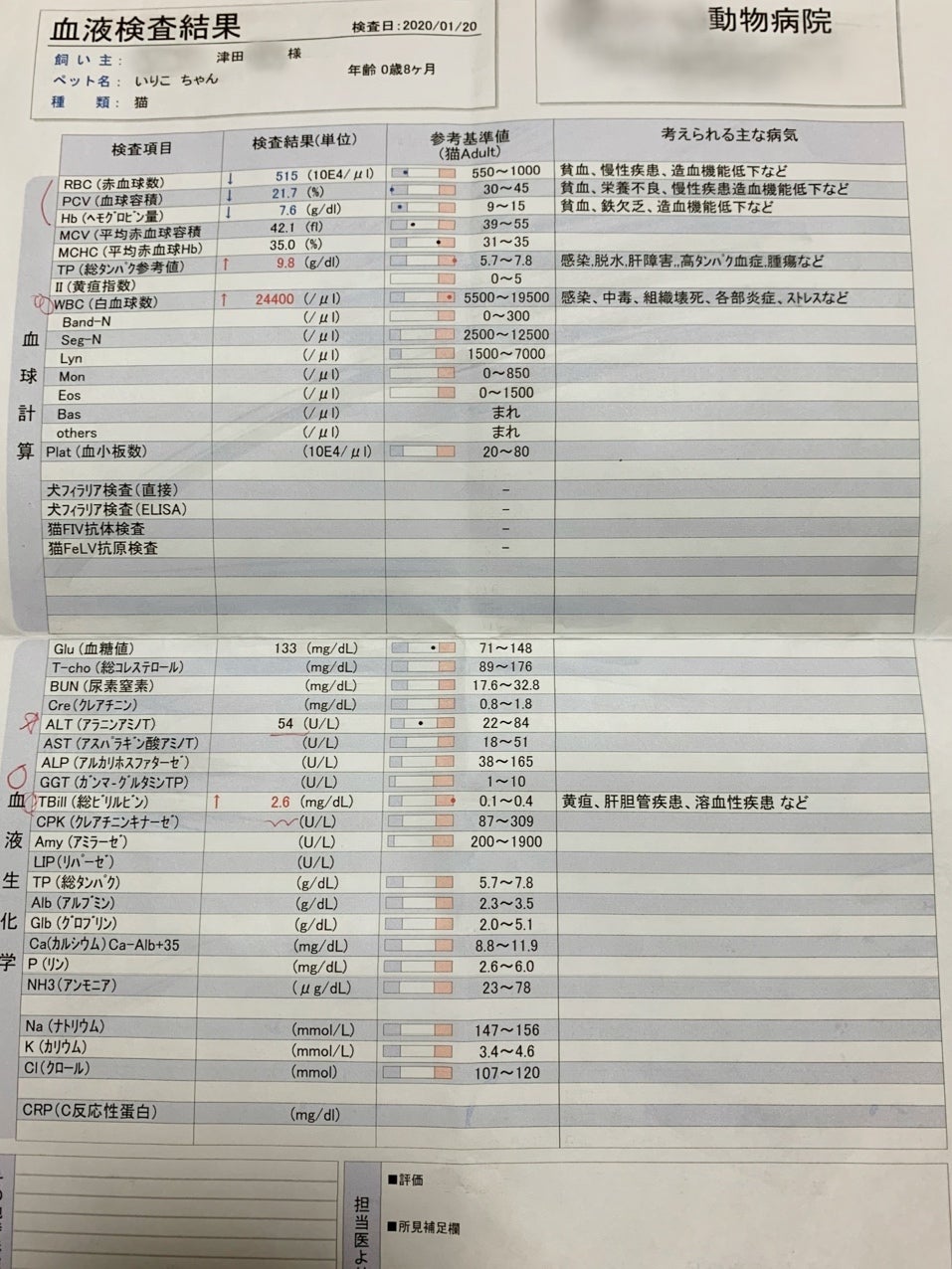 食欲が完全になくなり脱水症状も出る。黄疸の数値が上昇。FIPの可能性が高いと先生に言われる。血液検査でFIPの検査をお願いする。検査結果は1週間後