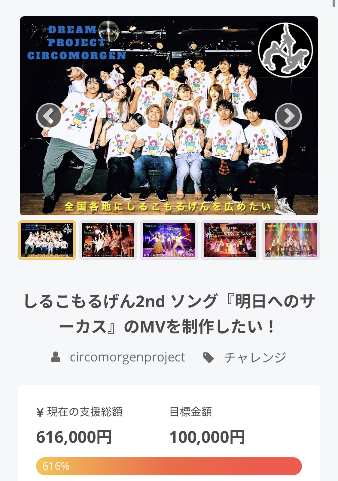 2021/03/19 13:48しるこもるげん2nd ソング『明日へのサーカス』ミュージックビデオ制作にあたり、2021年1月18日(月)〜3月15日(月) までの間、クラウドファンディングを行なってきましたが、多くの方から温かいご支援をいただき、844,000円 募ることが出来ました。(クラウドファンディング終了後、ご支援いただいた方も含みます)メンバー一同、心から感謝申し上げます!!今後とも、地域も盛り上げる企画を提案していきます!!しるこもるげん2nd ソング『明日へのサーカス』ミュージック・ビデオ完成は、4月中旬を予定しております。公開まで暫くお待ちください!!https://www.youtube.com/channel/UCrT8DO3hJc7-kT_RnaQLGVAそして、今回のプロジェクトが、タウンニュースに掲載されました!!https://www.townnews.co.jp/0204/2021/03/19/566387.html是非、ご覧になってください!!!!今回のプロジェクトを通して、商店街、近隣に住まわれる多くの方々から反響いただいております。本当にコロナ禍、大変な世の中ではありますが、やってよかったなと、思います!!そして、早くも現在、ミュージック・ビデオ第3弾《エンタメで地域興し》を目指すプロジェクトを企画しております。次は、どこの地域へ行くか…。告知をお楽しみにしてください!! もっと見る