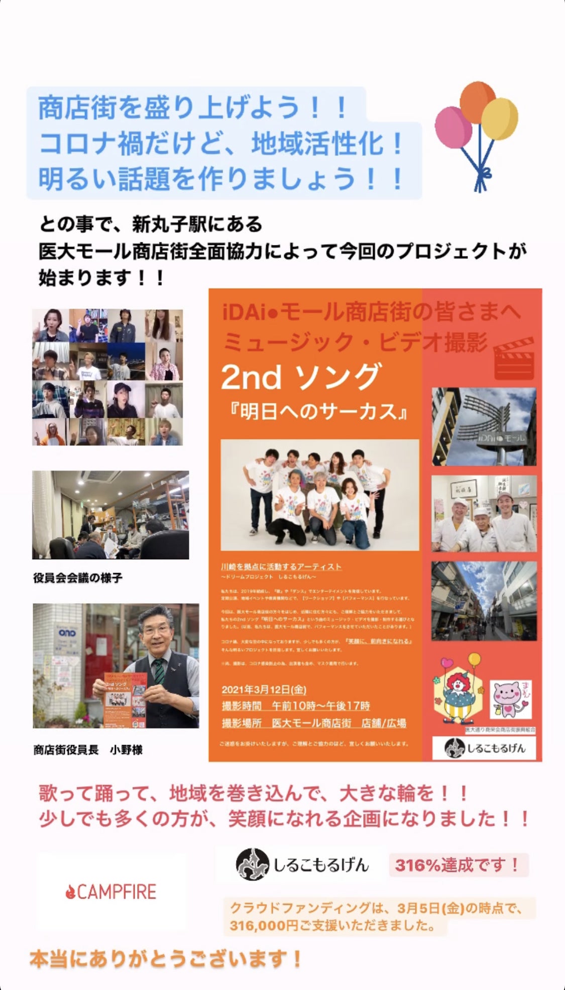 しるこもるげん2nd ソング『明日へのサーカス』ミュージックビデオ制作にあたり、2021年1月18日(月)〜3月15日(月) までの間、クラウドファンディングを行なってきましたが、多くの方から温かいご支援をいただき、844,000円 募ることが出来ました。(クラウドファンディング終了後、ご支援いただいた方も含みます)メンバー一同、心から感謝申し上げます!!今後とも、地域も盛り上げる企画を提案していきます!!しるこもるげん2nd ソング『明日へのサーカス』ミュージック・ビデオ完成は、4月中旬を予定しております。公開まで暫くお待ちください!!https://www.youtube.com/channel/UCrT8DO3hJc7-kT_RnaQLGVAそして、今回のプロジェクトが、タウンニュースに掲載されました!!https://www.townnews.co.jp/0204/2021/03/19/566387.html是非、ご覧になってください!!!!今回のプロジェクトを通して、商店街、近隣に住まわれる多くの方々から反響いただいております。本当にコロナ禍、大変な世の中ではありますが、やってよかったなと、思います!!そして、早くも現在、ミュージック・ビデオ第3弾《エンタメで地域興し》を目指すプロジェクトを企画しております。次は、どこの地域へ行くか…。告知をお楽しみにしてください!!