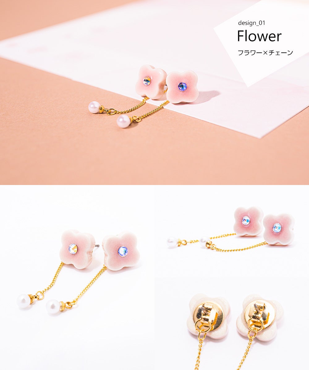 小ぶりな陶器はお花モチーフに、華奢なチェーンをプラスして耳元で軽やかに揺れます。
