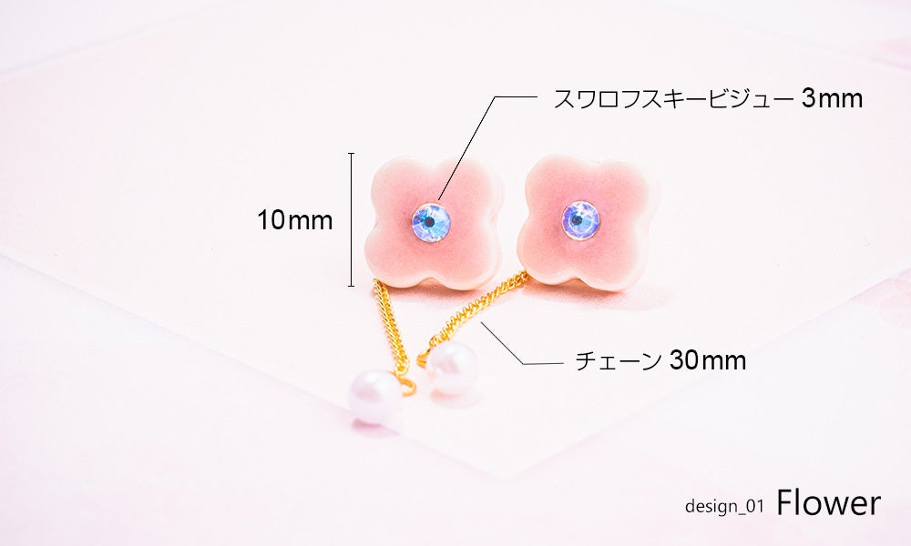 お花の中心にはスワロフスキービジューでキラキラ。プチサイズだから目立ちすぎず女性らしさを演出します。ピアスとイヤリングをご用意。ピアスはアレルギーに配慮したチタンポストを採用しています。