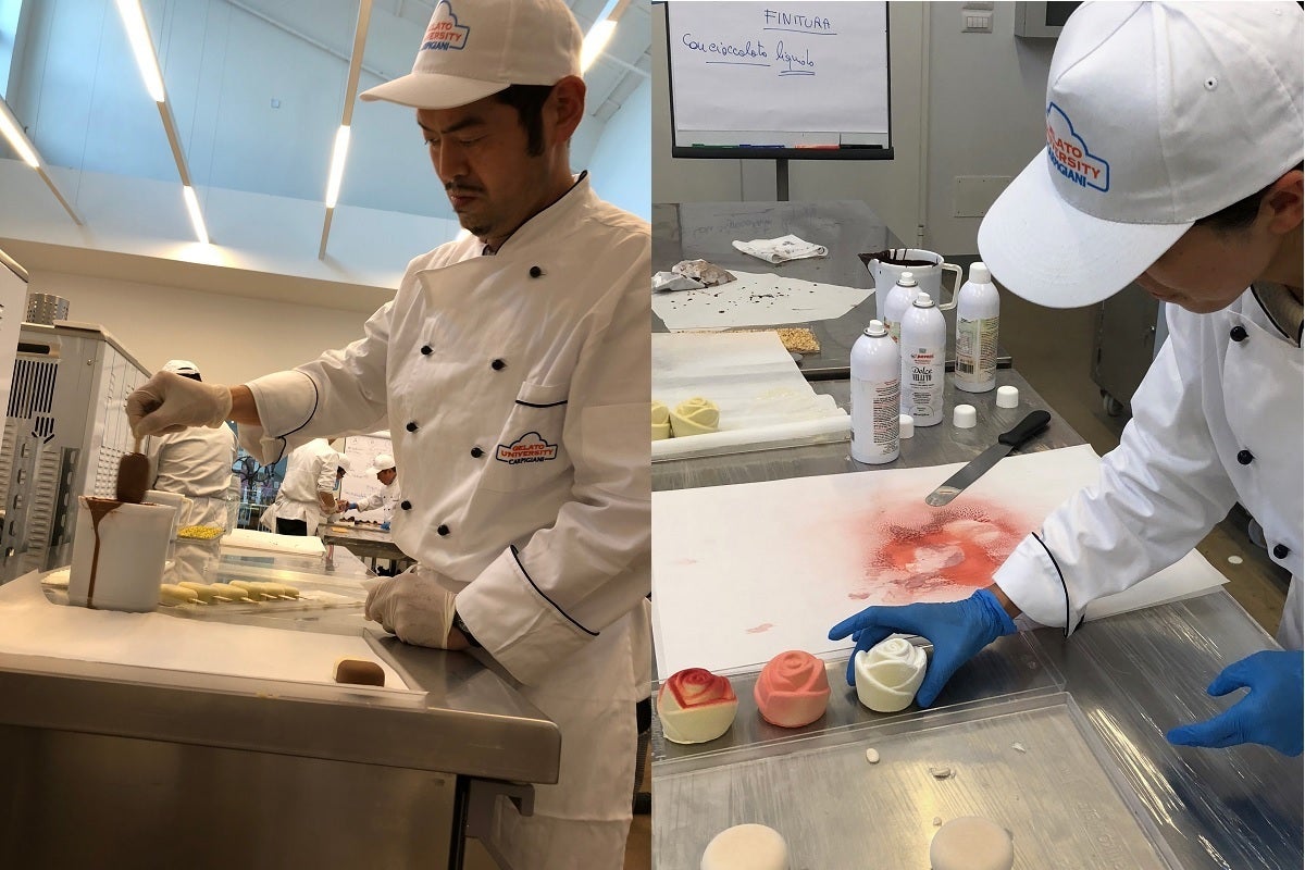 イタリアで活躍する有名な講師から、多種多様なジェラートを学び、幾つものジェラートマシンを使って実践するとても有意義なセミナーでした。プロのレシピ作りは緻密で、甘味料も3〜4種類を使いこなします。ターゲットを絞り、そこにピタリとハマるレシピをとことん追求していきます。