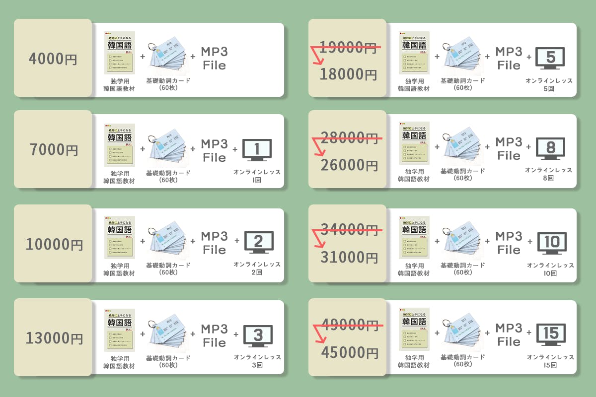 10000円 ➞ 独学用韓国語教材 + 基礎動詞カード(60枚) +MP3ファイル + オンラインレッスン2回