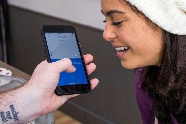 相手にはスマートフォンに向かって話してもらえば、イヤフォンから日本語訳が流れて双方向に翻訳がされる形です。