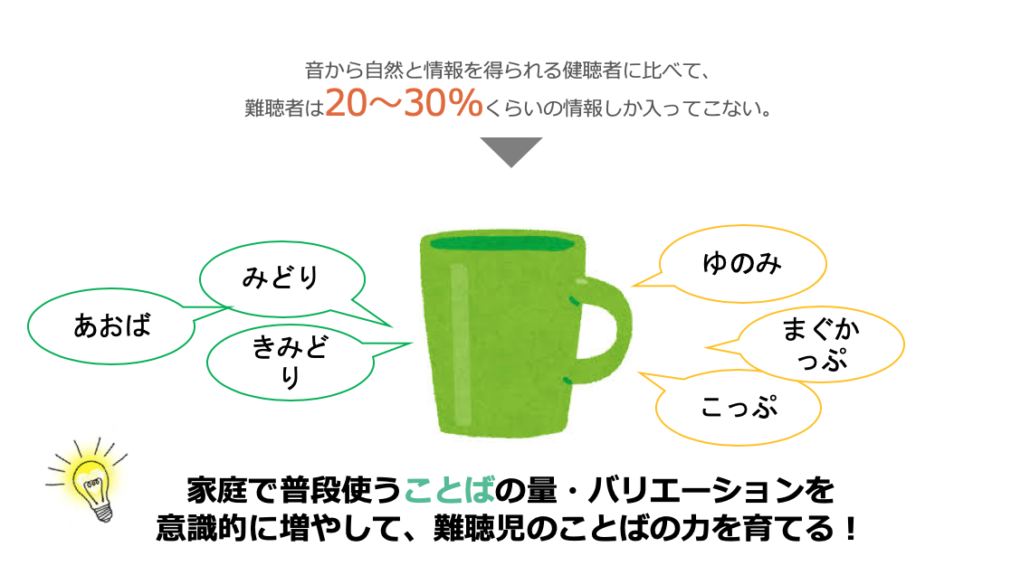 しかし、難聴児は耳が聴こえないので「マグカップ」や「ゆのみ」を知らないまま育ってしまいます。