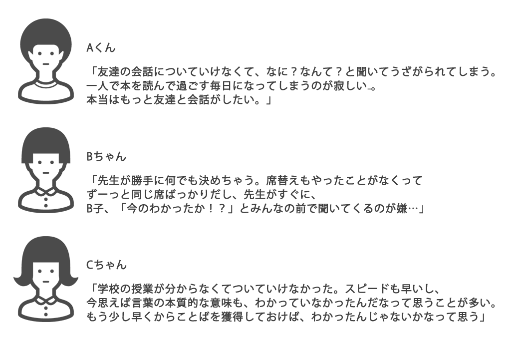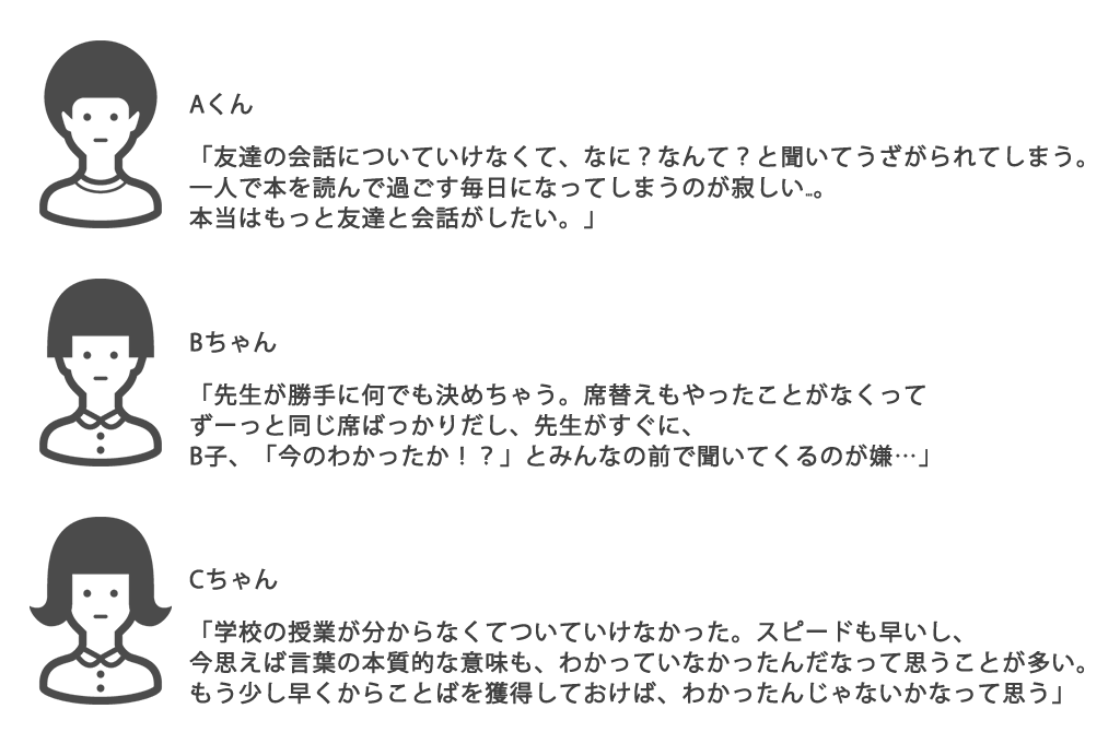 小学校になると、親御さんはどうしても勉強が出来ないことに目がいってしまい、教科学習をやらせがちになるのですが、そもそもの「ことばの土台」がないと、勉強も理解できません。