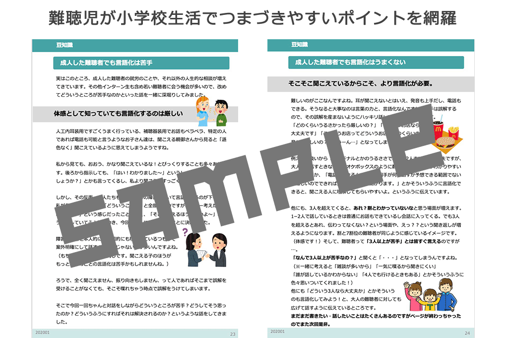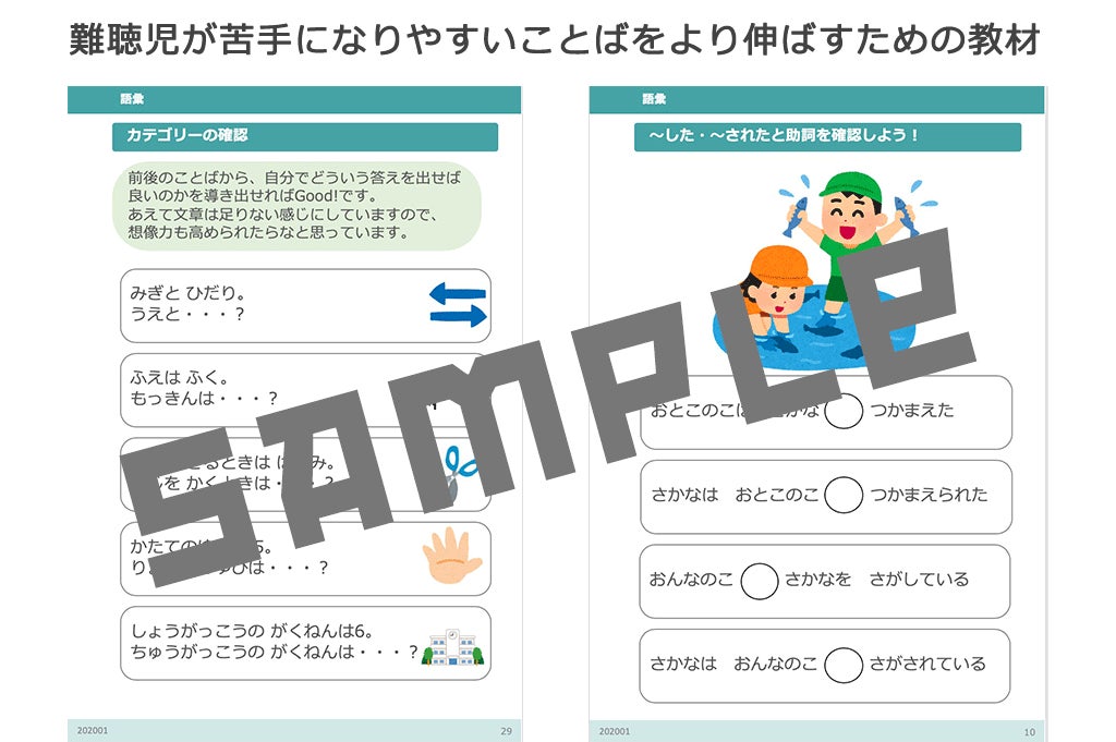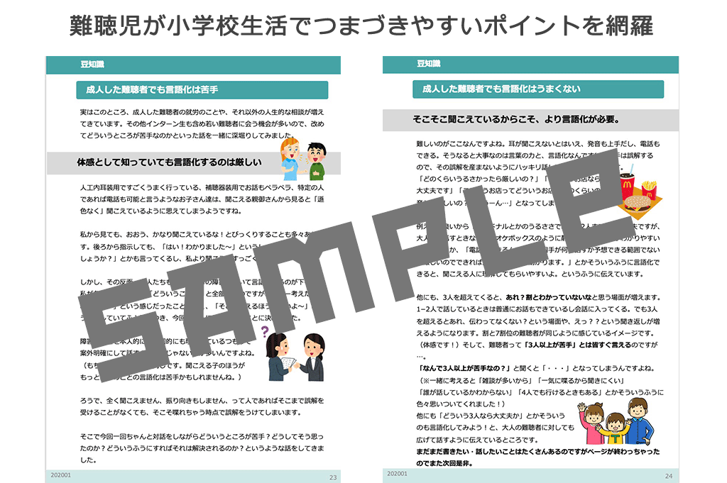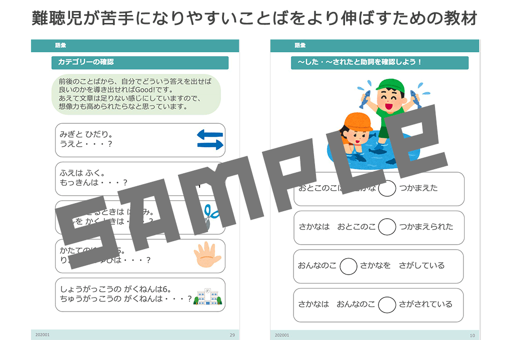 今回は、小学生になる子どもたち向けに、ことばの教材に加えて、一般の学校に通う難聴児が困るポイントも記載した教材を作成したく思っています。