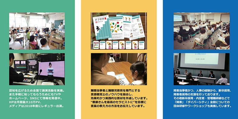 デフサポでは、代表であり、かつ当事者である牧野と、言語聴覚士などの専門スタッフ、当事者の親、学校教諭など多種多様のメンバーでチームを組んでいます。<デフサポでは以下を中心に実施しています。>