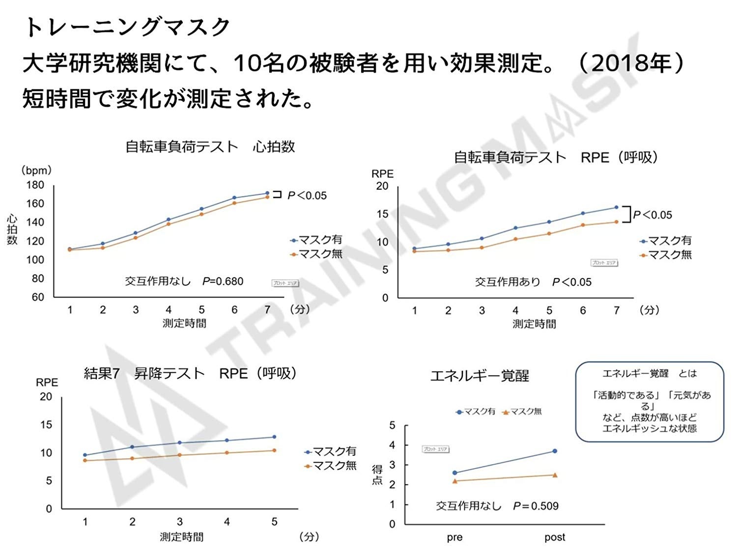 こちらではスペースの都合上多くは記載できませんが、トレーニングマスク社は何年も前からトレーニングマスクを利用する事による持久力への作用などを、実験で測定し、商品の改善を繰り返しております。