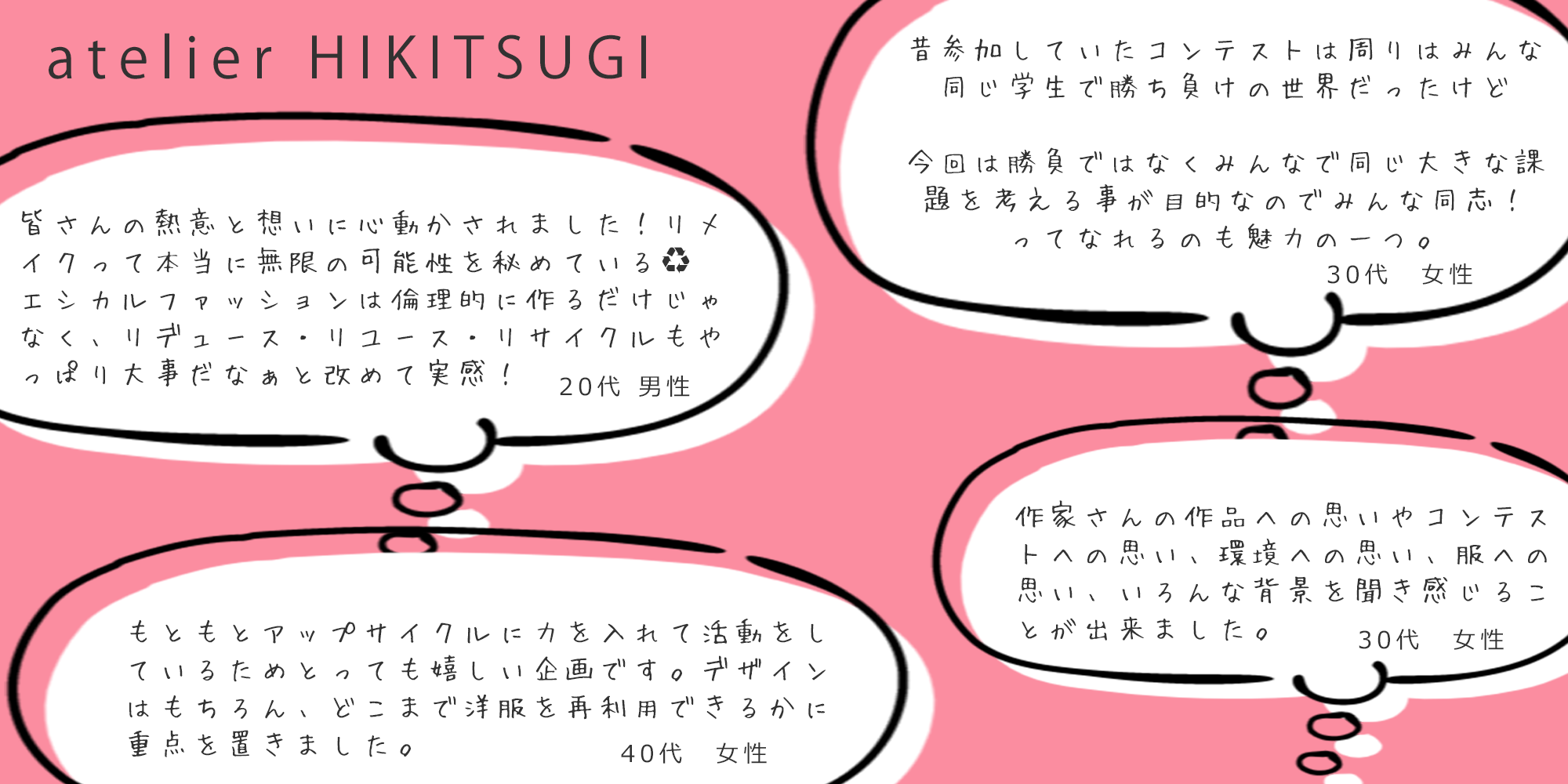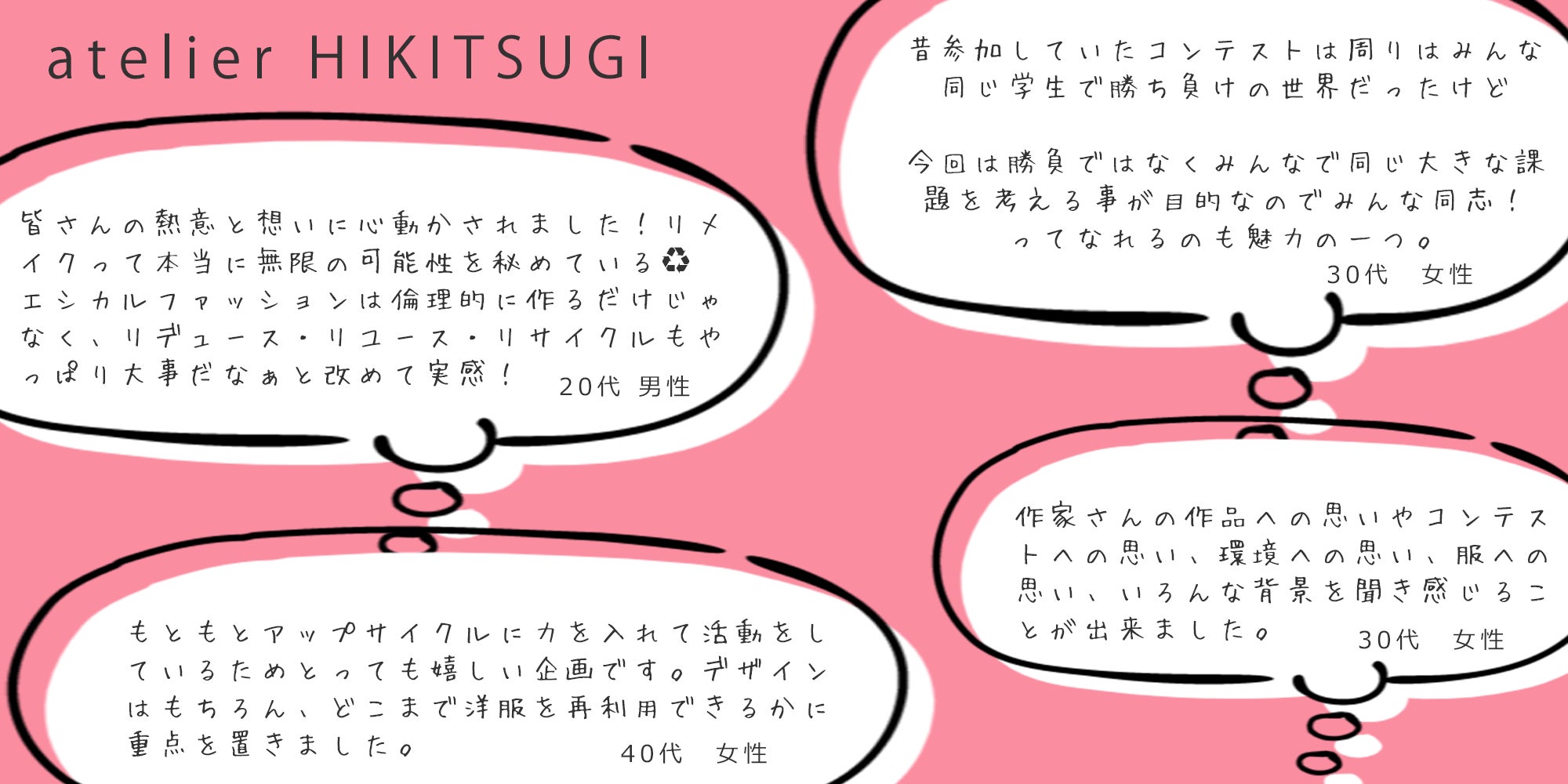 昨年秋には、今までの「古着」とは毛色の違うプロジェクトをスタートさせました。「捨てない!新品廃棄在庫で作るリメイクコミュニティ:Atelier Hikitsugi (アトリエヒキツギ)」です。このプロジェクトでは、リメイクコンテストに応募したリメイカーさんの力で、約1000点の新品在庫が200点以上ものリメイク商品に生まれ変わりました。廃棄されてしまっている13億から比べれば微々たる数字ではありますが、クリエイティビティとコミュニティの力で「捨てる」問題を解決する糸口になったイベントでした。今夏に第二回を開催予定です。