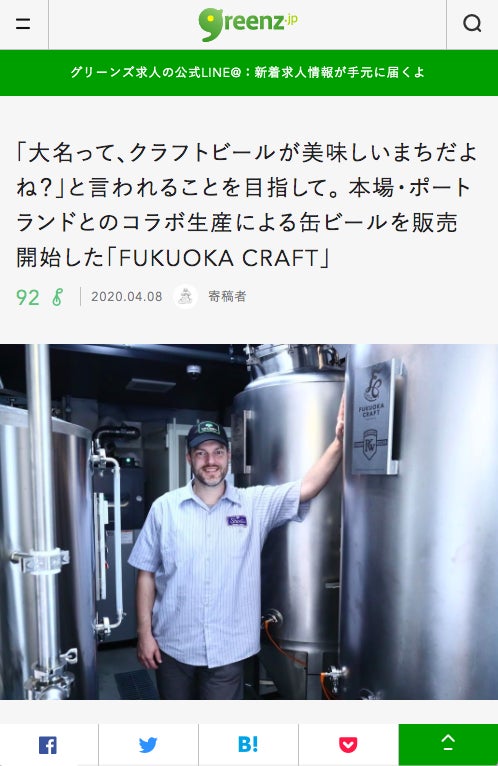 「一人ひとりが『ほしい未来』をつくる、持続可能な社会」をめざすウェブマガジンgreenz.jpさんに、取り組みを紹介していただきました!「大名って、クラフトビールが美味しいまちだよね?」と言われることを目指して。 本場・ポートランドとのコラボ生産による缶ビールを販売開始した「FUKUOKA CRAFT」https://greenz.jp/2020/04/08/fukuoka_craft/ご紹介ありがとうございます!